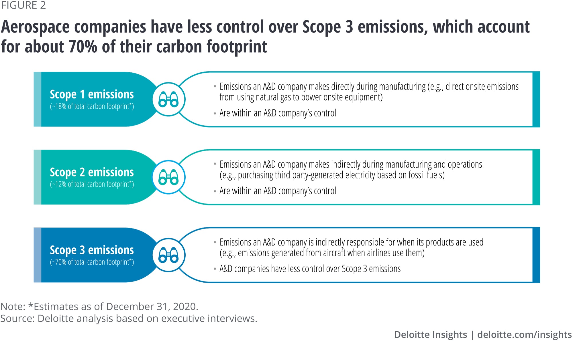 While some aerospace companies are making good progress in understanding the emissions they directly generate, mapping their emissions footprint right across the value chain can be a far bigger challenge. Scope 1, Scope 2, and Scope 3 are ways of categorizing the different kinds of carbon emissions an aerospace company creates in its own operations, and in its wider value chain (figure 2).
