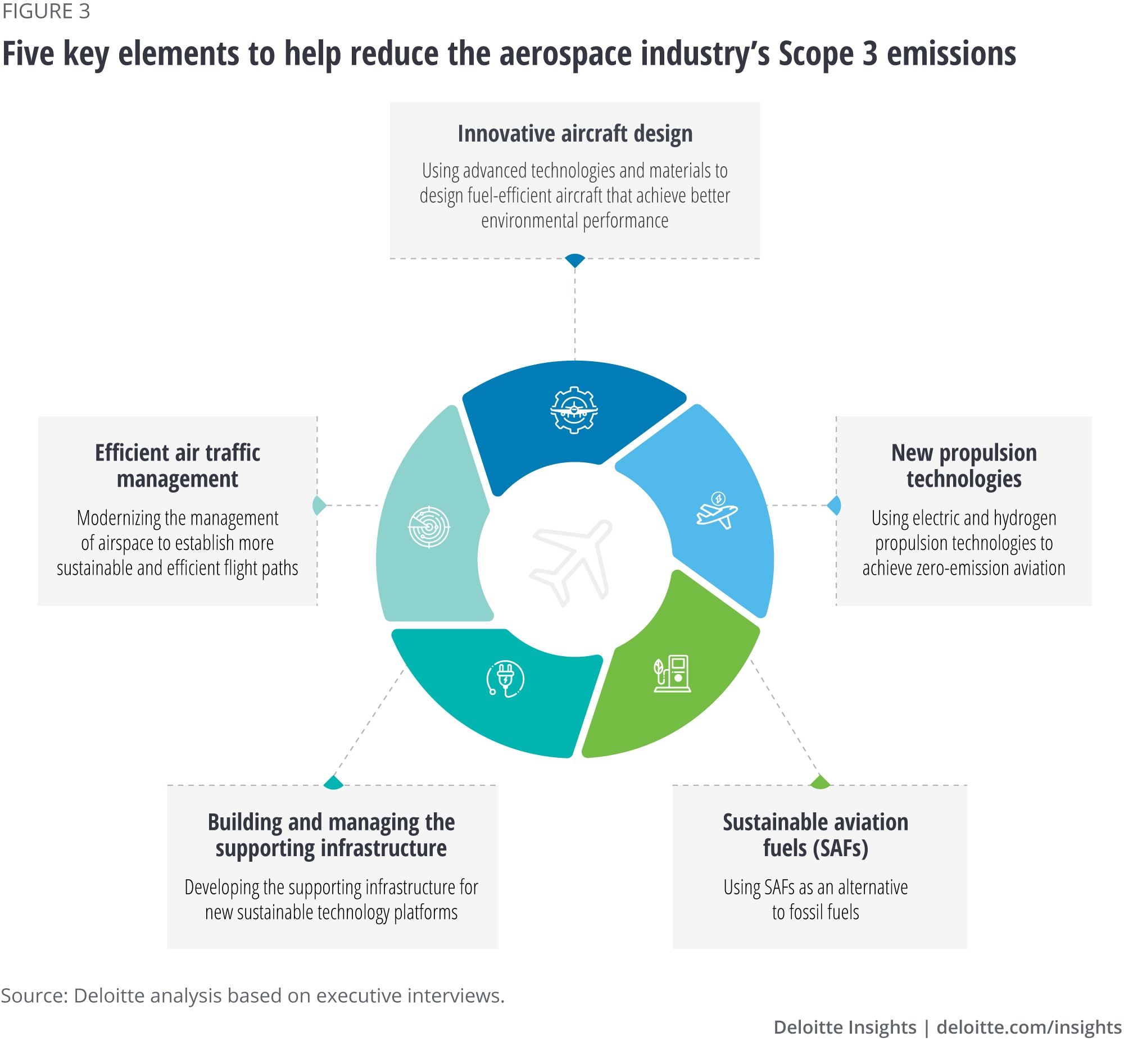 36. s study differs from Deloitte’s Decarbonizing aviation: Clear for take-off ” report in three key ways—(i) this study discusses Scope 1, 2, and 3 emissions; (ii) this study discusses all the potential solutions such as air traffic management and enabling ground infrastructure to reduce aerospace industry’s Scope 3 emissions; and (iii) the focus of this study is on electric propulsion while the other study focuses more on SAFs.
