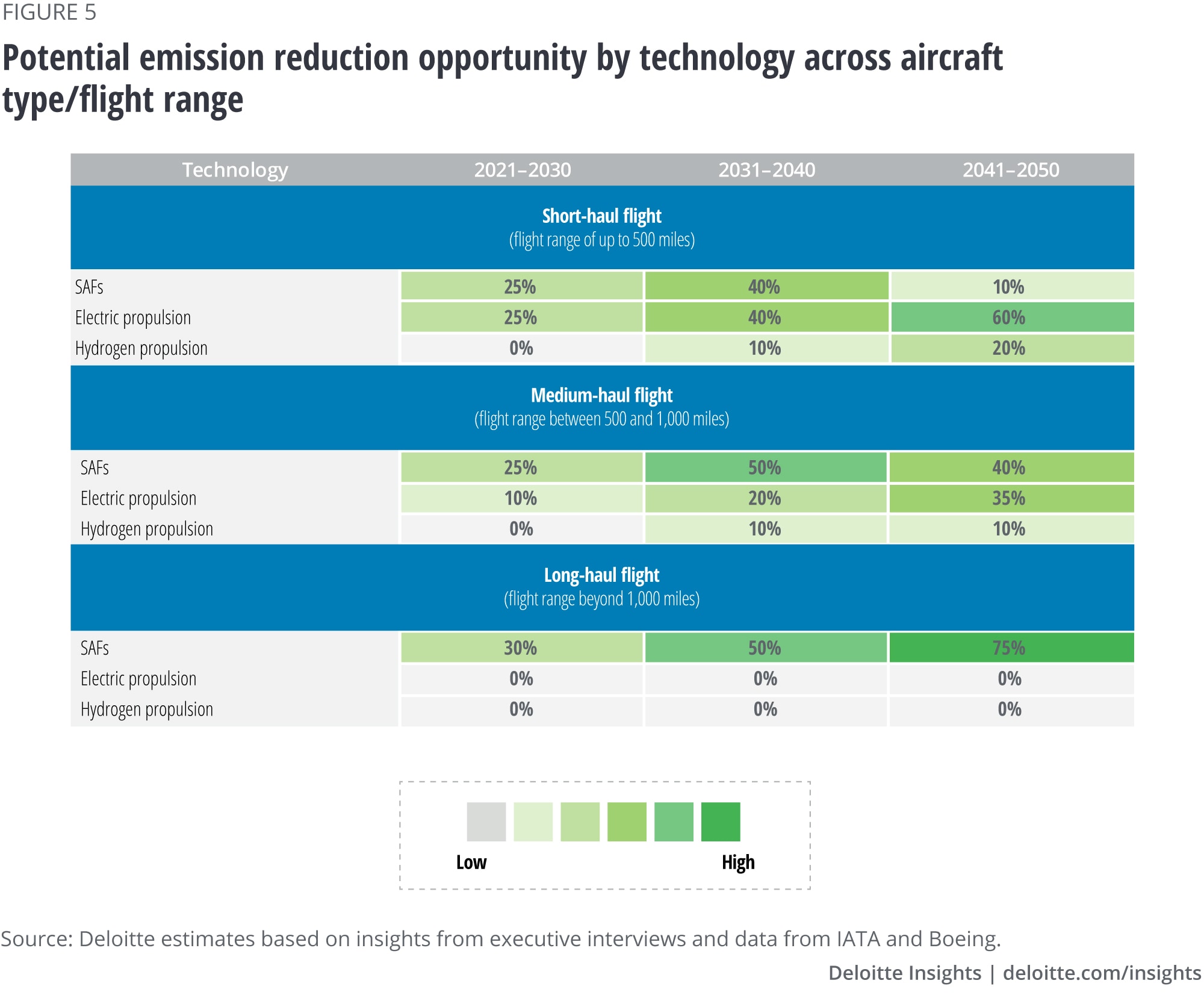 Moreover, SAFs might be the best possible solution for reducing emissions in medium-to-long-haul flights, while electric propulsion is likely the most feasible zero-emission solution for smaller aircraft and short-haul flights. Deloitte estimates that SAFs could help reduce 75% of the emissions generated by all long-haul flights (flight range beyond 1,000 miles) by 2050 and electric propulsion could reduce 60% of the emissions generated by all short-haul flights (flight range of up to 500 miles) by 2050 (figure 5). Further, SAFs and electric propulsion may help reduce 40% and 35% of the emissions generated by all the medium-haul flights (flight range of 500–1,000 miles) by 2050, respectively.