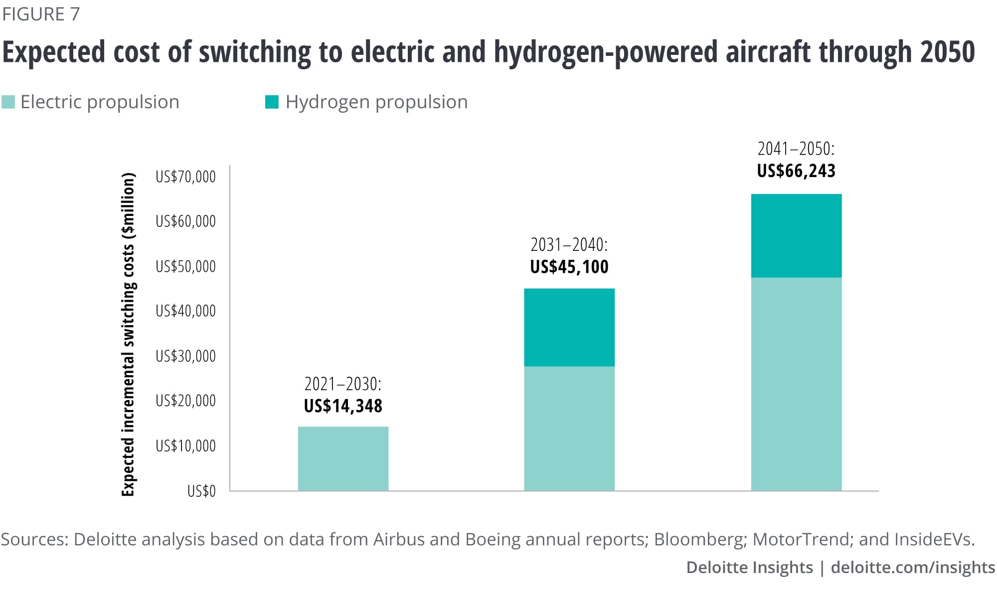 One of the biggest challenges of successfully scaling the new propulsion technologies is that the aerospace industry would have to make significant investments and work with the extended value chain to build infrastructure. Deloitte estimated the incremental cost of switching to electric and hydrogen propulsion, mainly for short-to-medium-haul flights, could add up to US$125 billion by 2050 (figure 7).