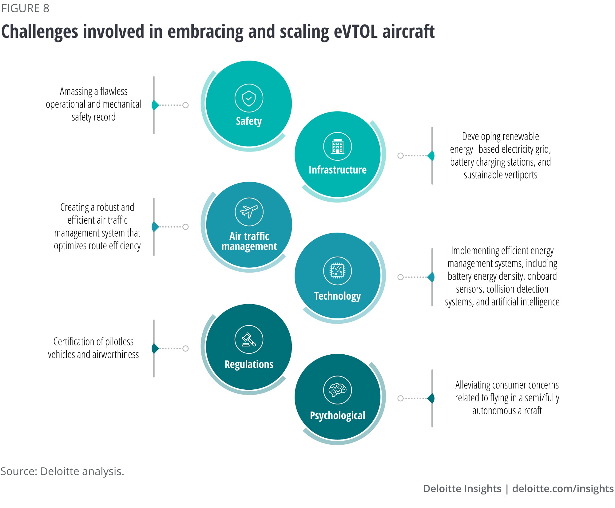 However, several challenges must be overcome before the industry can see widescale adoption of eVTOL aircraft (figure 8). Regulations—especially regarding the allocation of airspace (lower altitudes to higher altitudes)—could challenge eVTOL aircraft’s potential for exponential growth.38