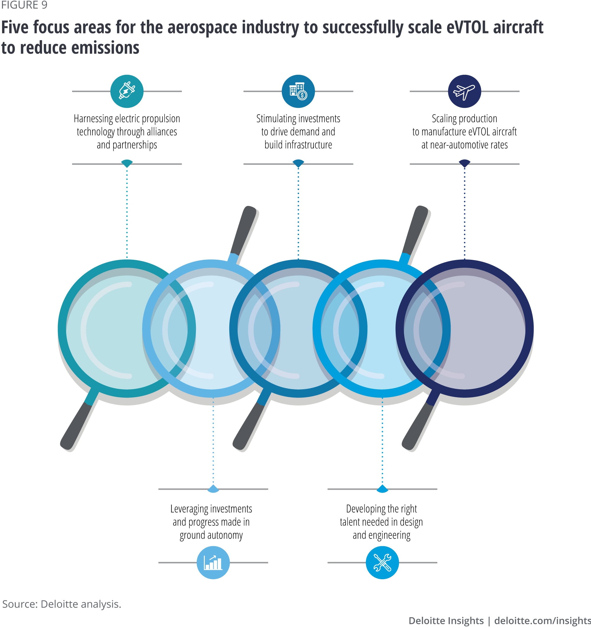 Specifically, driving adoption and growth of eVTOL aircraft could be difficult without significant collaboration among all the ecosystem players. There are five focus areas the aerospace industry should consider to address the hurdles and scale electric propulsion to reduce emissions that can bring a paradigm shift in how it currently operates (figure 9).