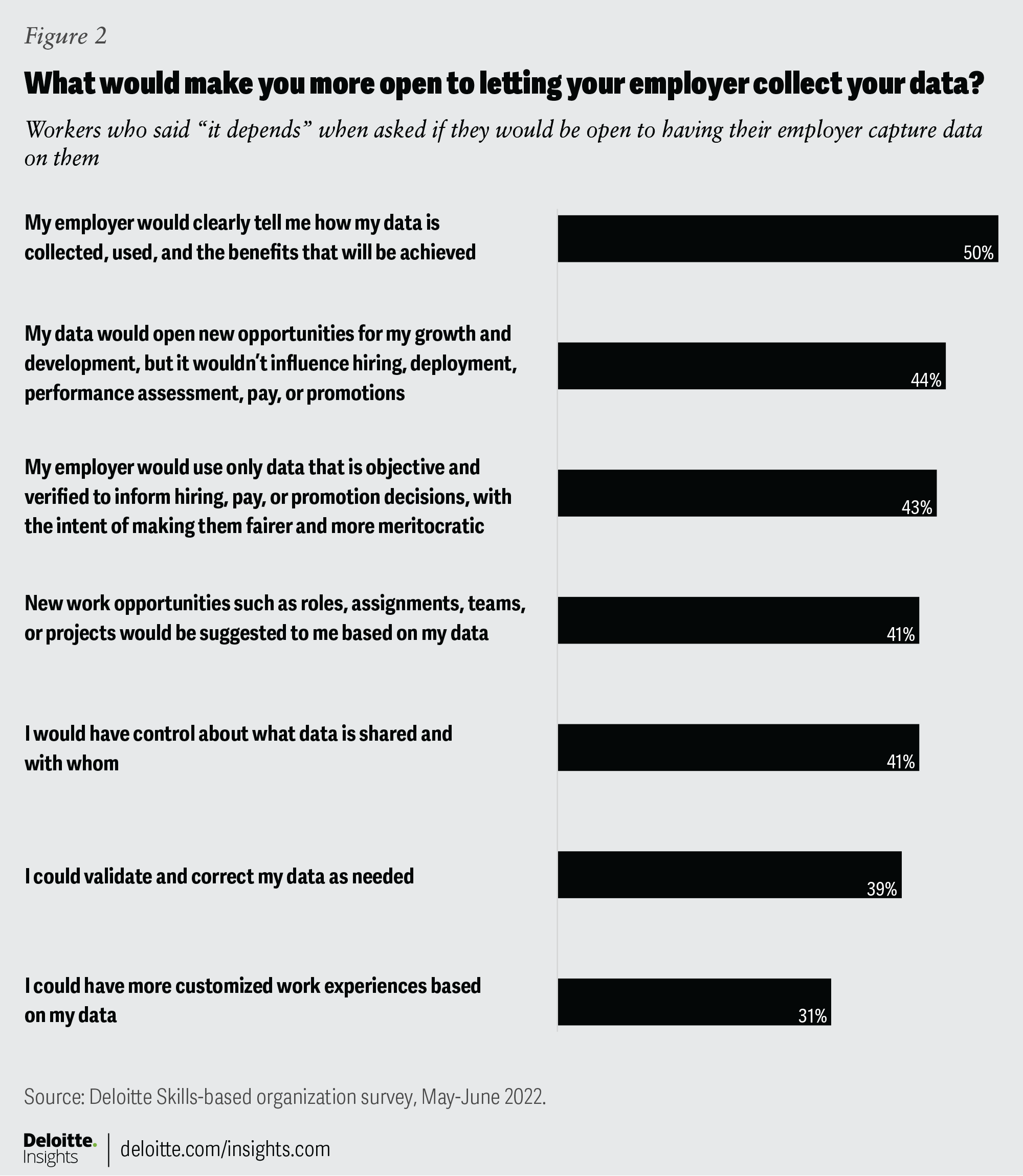 Studies show that workers are willing to share data—but there are some conditions. According to a study published in Harvard Business Review, 90% of employees surveyed are willing to let their employers collect and use data about them and their work, but only if it benefits the employee in some way.8 A more recent Deloitte study on skills-based organizations confirmed that the vast majority of workers surveyed are willing to share data on everything from their skills, interests and passions, preferences, and performance on informal work in projects or internal gigs not directly related to their job, but many say it would depend on whether their employer offered them benefits in return (figure 1).9
