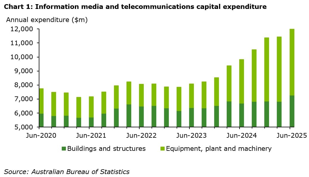 These trends are already starting to show up in investment spending data. Capital expenditure in the information media and telecommunications (IT) industry has surged over the past two years as data centre facilities have been built and equipment purchased to support their operation. Real annual expenditure on buildings and structures has risen by 14% since June 2023 while spending on equipment, plant and machinery has skyrocketed by 191%. A national data centre strategy is set to be released by the Federal Government at the end of the year to guide expansion of the industry and ensure foreign investment guidelines are appropriate for its rapid growth.