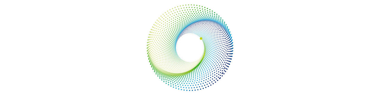 Abstract spiral of green and blue dots forming a circular swirl.