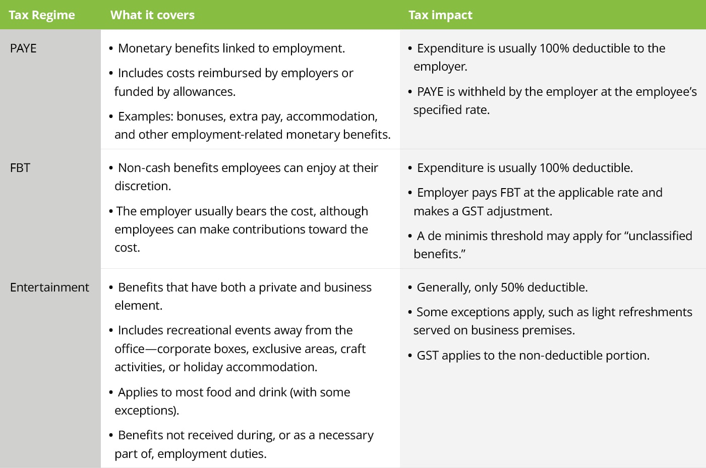 The FBT regime then comes in to capture non-cash benefits that are provided to employees in connection with their employment. While there is some overlap between the entertainment rules and FBT, the entertainment rules will generally override FBT, unless: