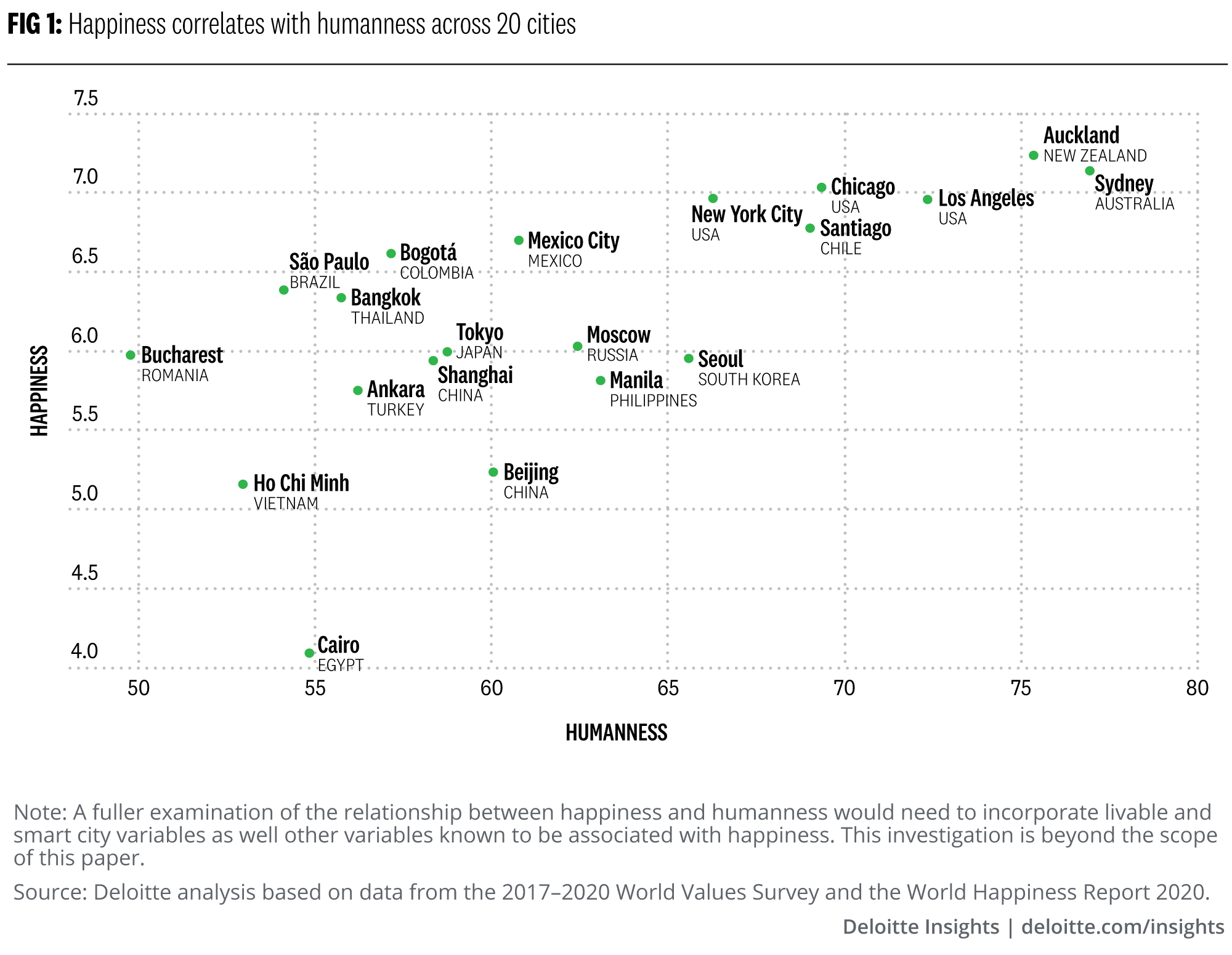 Happiness as an outcome for cities is imperative, as it’s a significant predictor of peoples’ resilience in adversity. From the plot in figure 1, it’s evident that there’s a positive relationship between a city’s “humanness,” as measured using proxies from the 2017–2020 World Values Survey, and its residents’ happiness, as measured by the World Happiness Report 2020, which ranks nations and cities on their citizens’ happiness based on respondents’ ratings of their lives.6