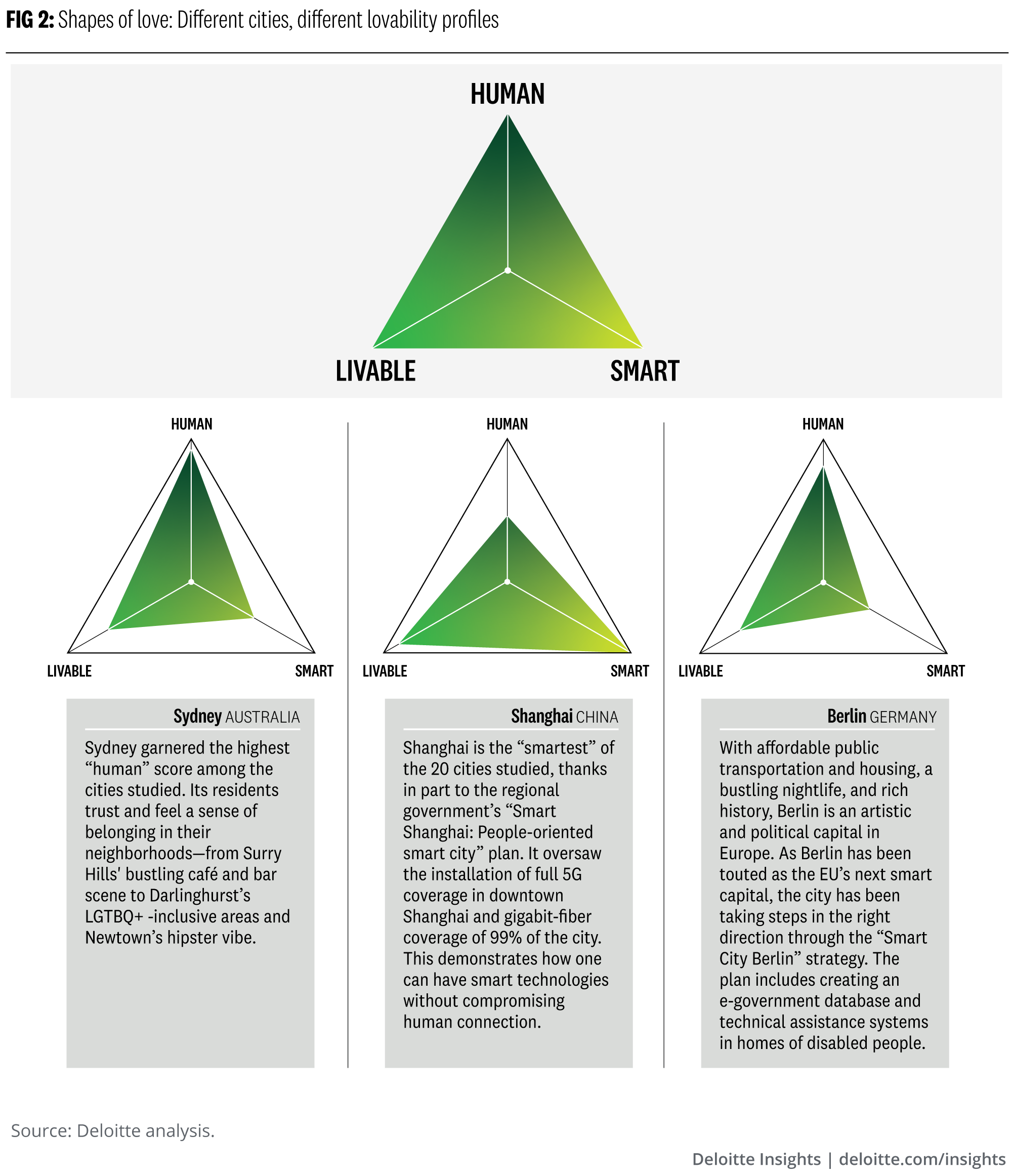 Zooming out now to lovability as a whole, it’s possible to find proxies for each of its three central qualities—livable, smart, and human—to measure and visualize a city’s lovability. The figure “Shapes of love” shows these shapes of love, according to several chosen proxies, for the three cities of Shanghai, Sydney, and Berlin.