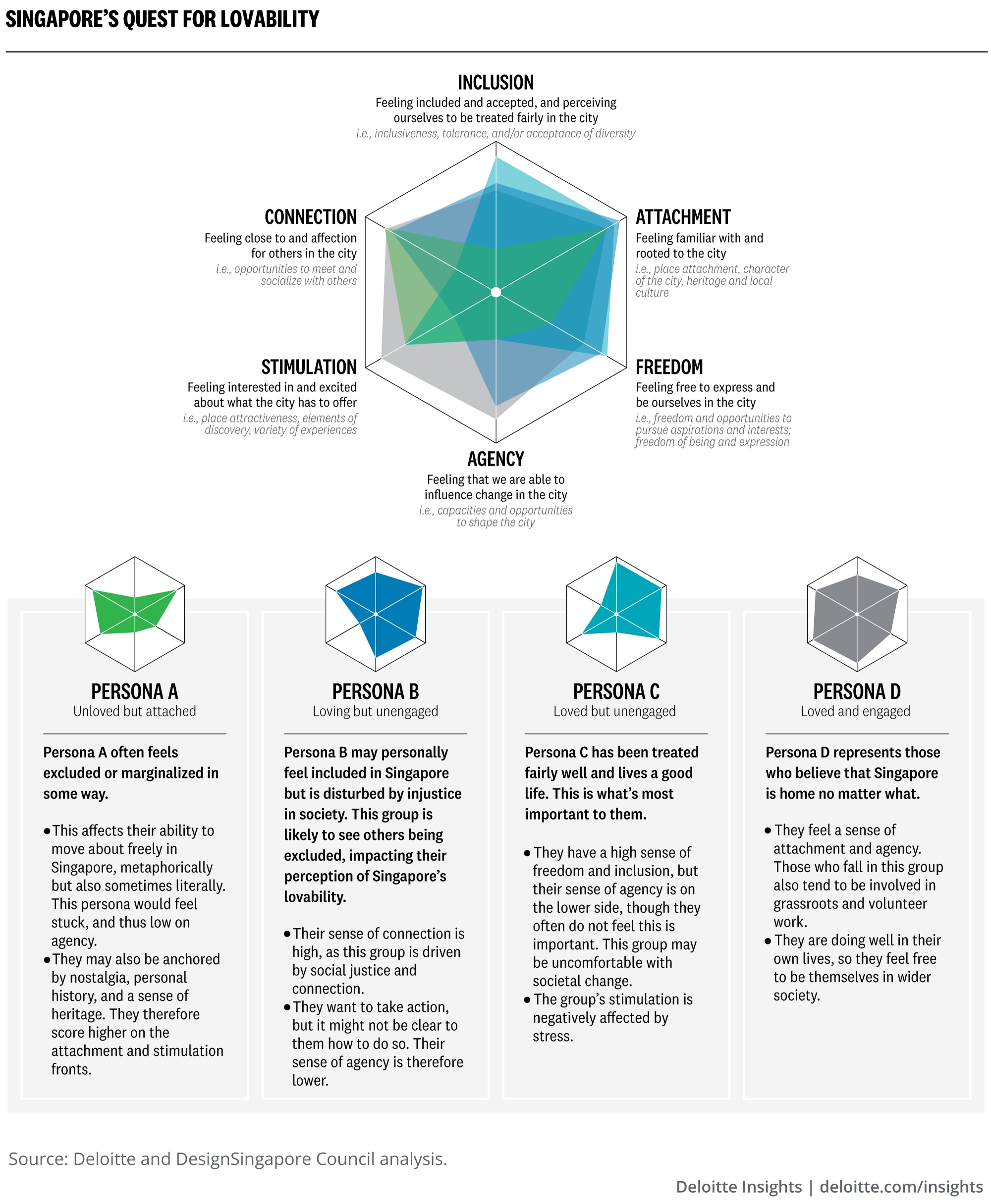 From this research, Dsg mapped four personas—unloved but attached, loving but disengaged, loved and engaged, and loved but disengaged—to the six emotional connections of the “human” dimension of lovability, using the same visualization approach as used to map a city’s livable, smart, and human attributes more broadly. The mappings were then stacked to identify where more targeted approaches may be needed for the city to be lovable to these personas. For instance, issues around a lack of attraction—the study’s synonym for stimulation—were found to be associated with a lack of vibrancy in public spaces due to over-curation and regulation.