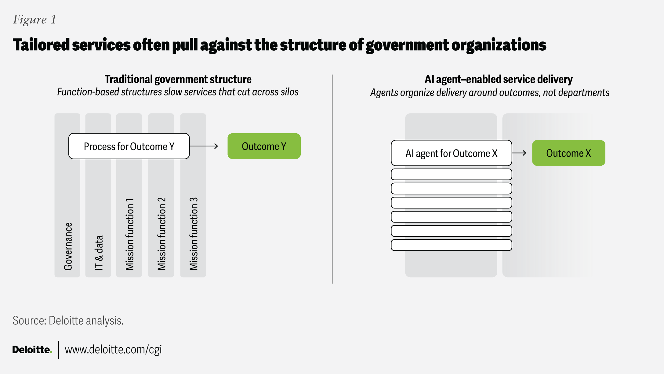 Yet, customized services still challenge traditional structures. Agencies are organized by function and domain, while individuals’ needs often cut across boundaries. Enter AI agents, built around workflows and outcomes rather than departments or functions. They don’t need to cut across silos—they operate outside them—thereby helping to overcome structural constraints (figure 1).