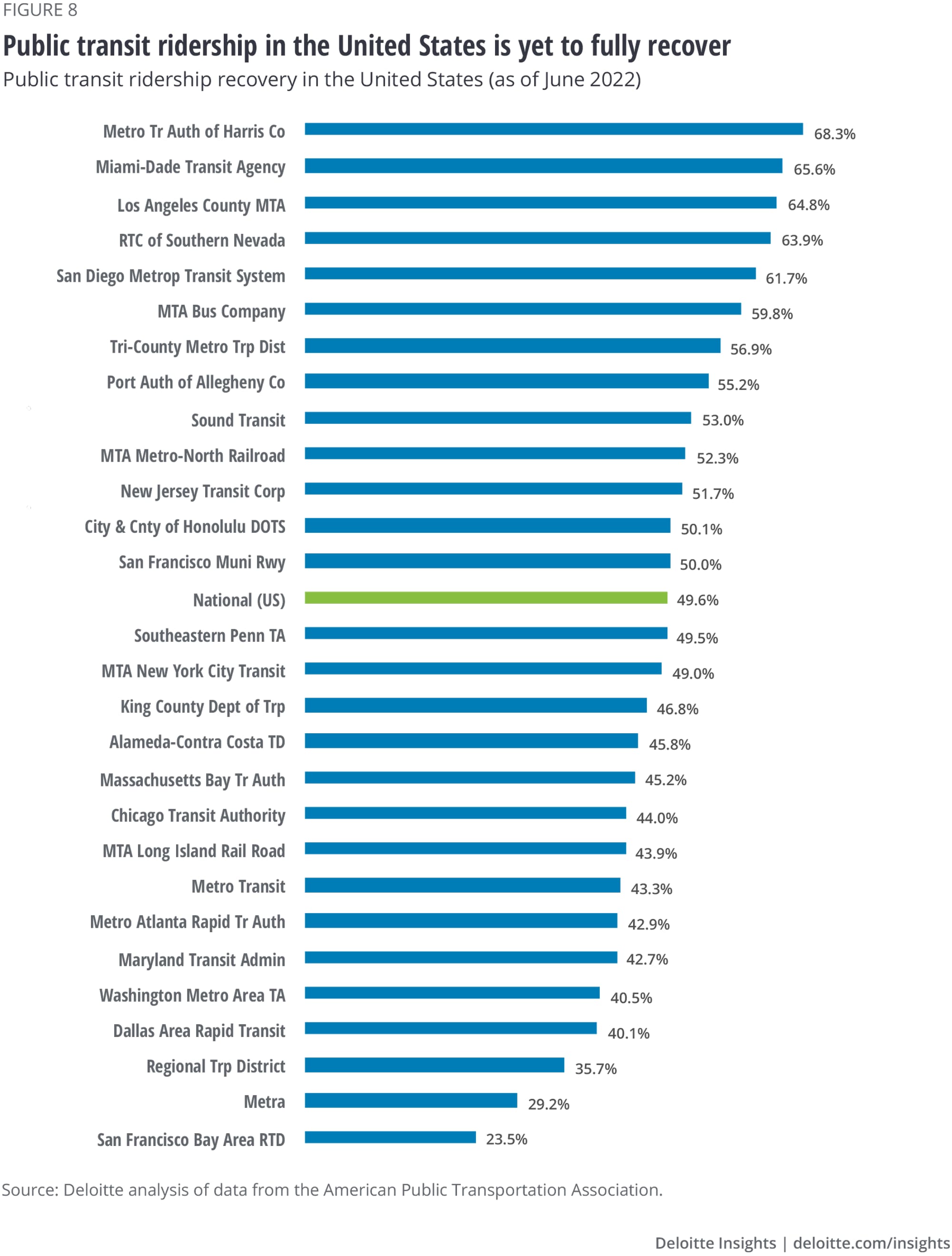 Without warning, the COVID-19 pandemic altered how communities work, move, and connect. Two years later, some of these changes—such as the white-collar shift to remote work—have proven durable; more than two-thirds of companies report that they will be implementing a hybrid work model of some kind.35 As of June 2022, office buildings in the 10 largest US cities averaged just 43% occupancy, according to office security provider Kastle Systems, while public transit ridership remains well-below prepandemic levels (figure 8).36 Other changes have continued to follow shifting patterns of shopping, employment, and leisure activity.