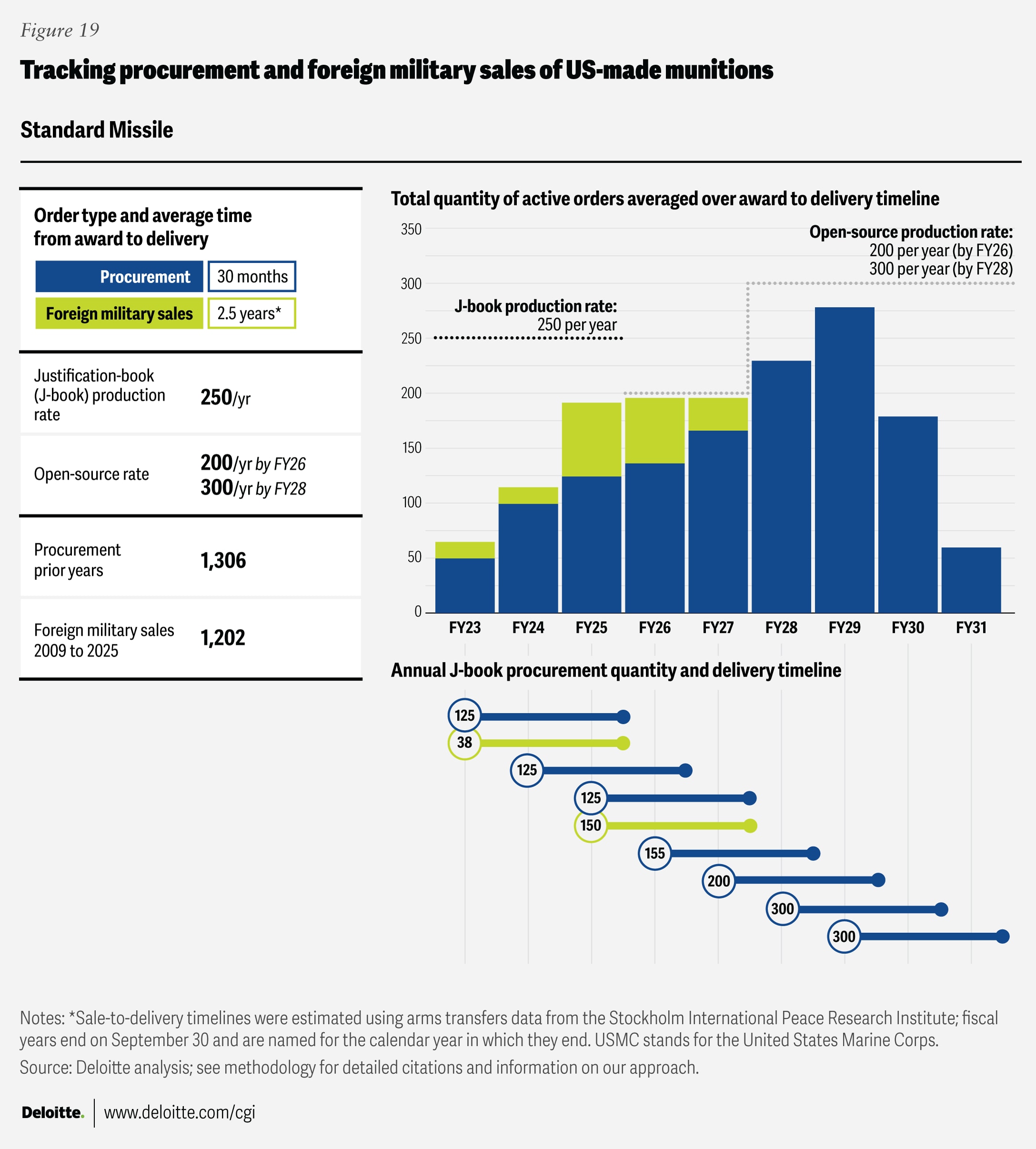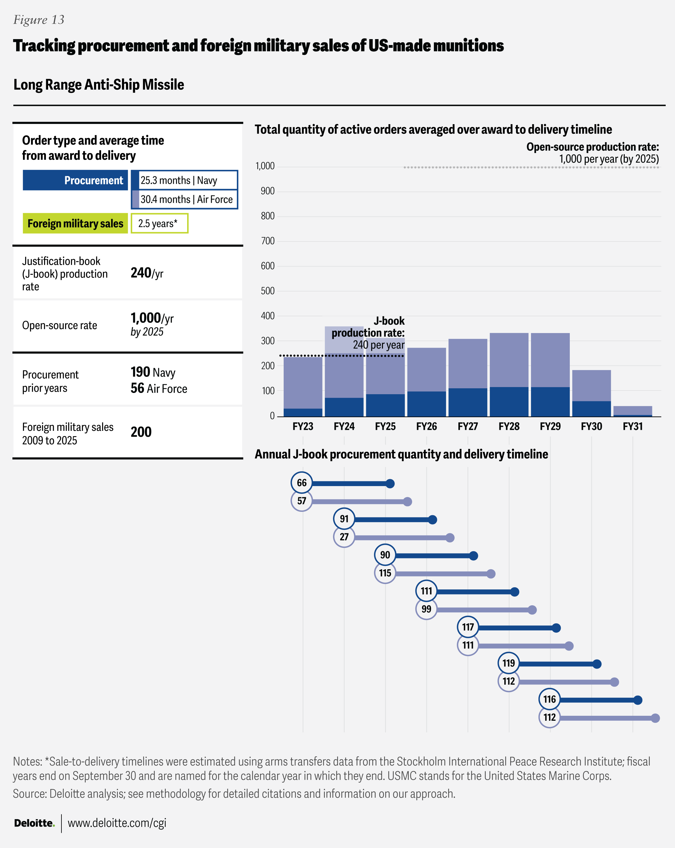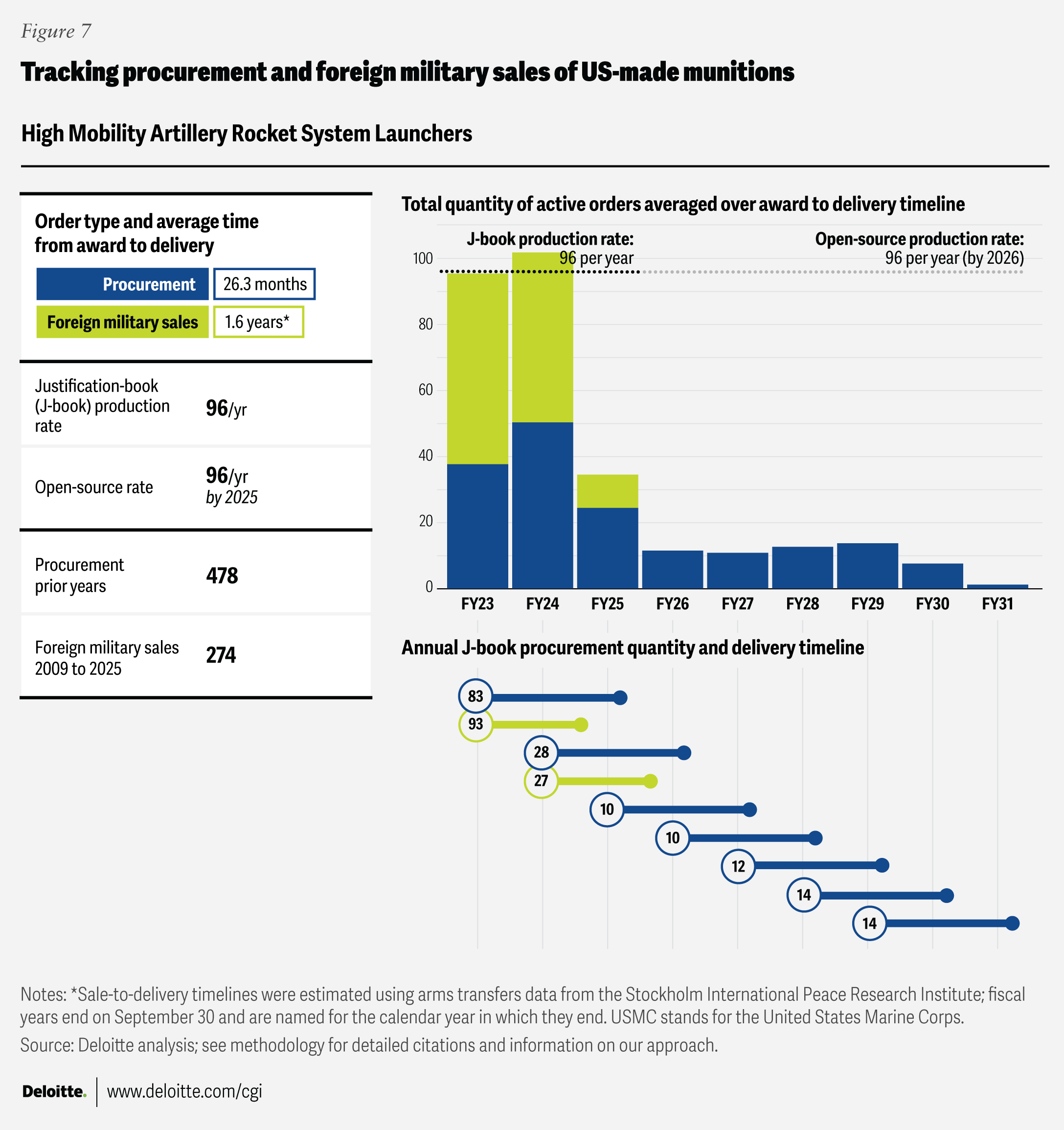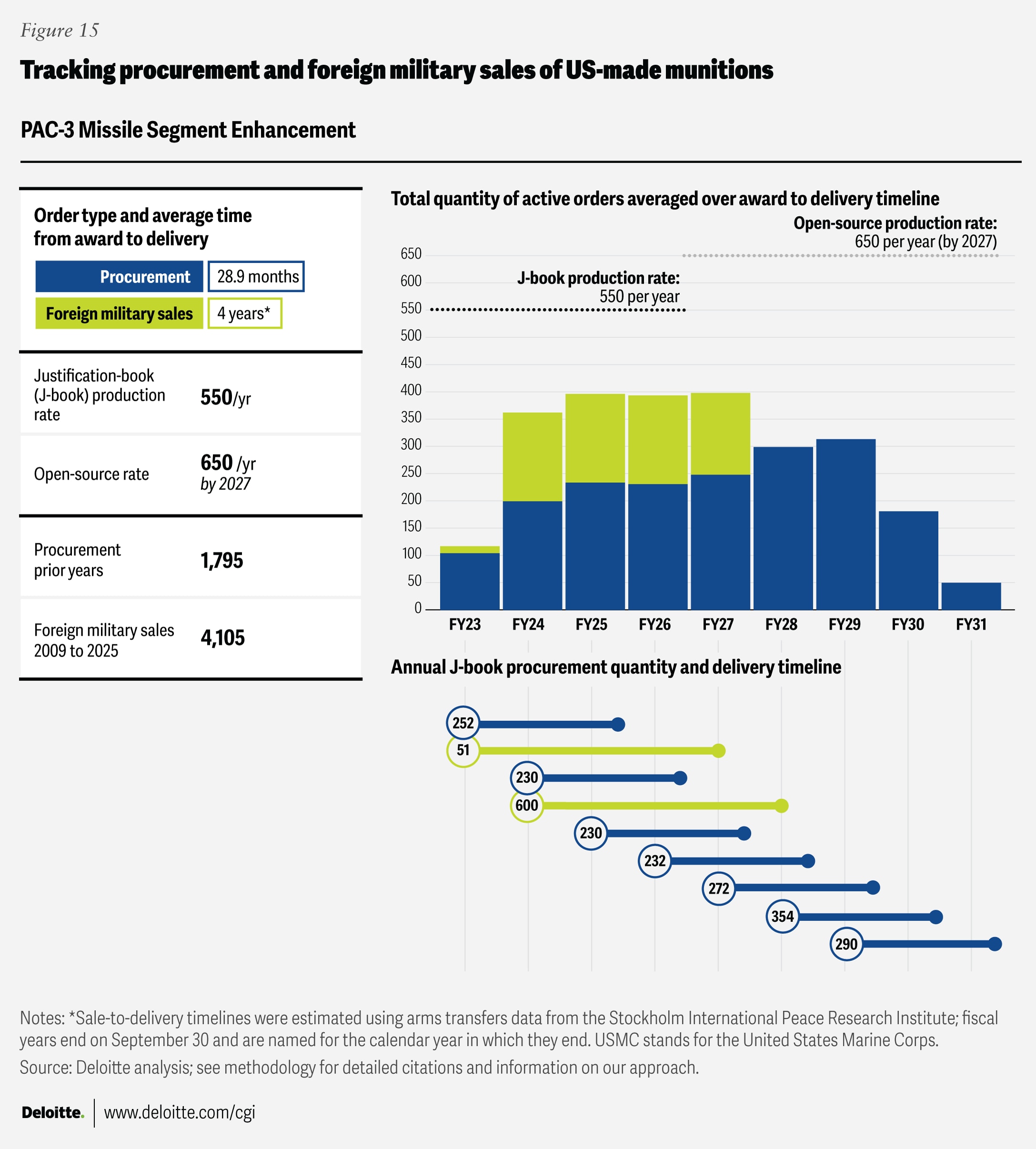 Where “open-source production rates” are cited, the figures come from publicly available sources listed in the endnotes section. Foreign military sales quantities were drawn from the Defense Security Cooperation Agency, and average foreign military sales award-to-delivery timelines were calculated using data from the Stockholm International Peace Research Institute’s Arms Transfers Database. Blank fields indicate that no data was available in the relevant J-book or other open-source references.