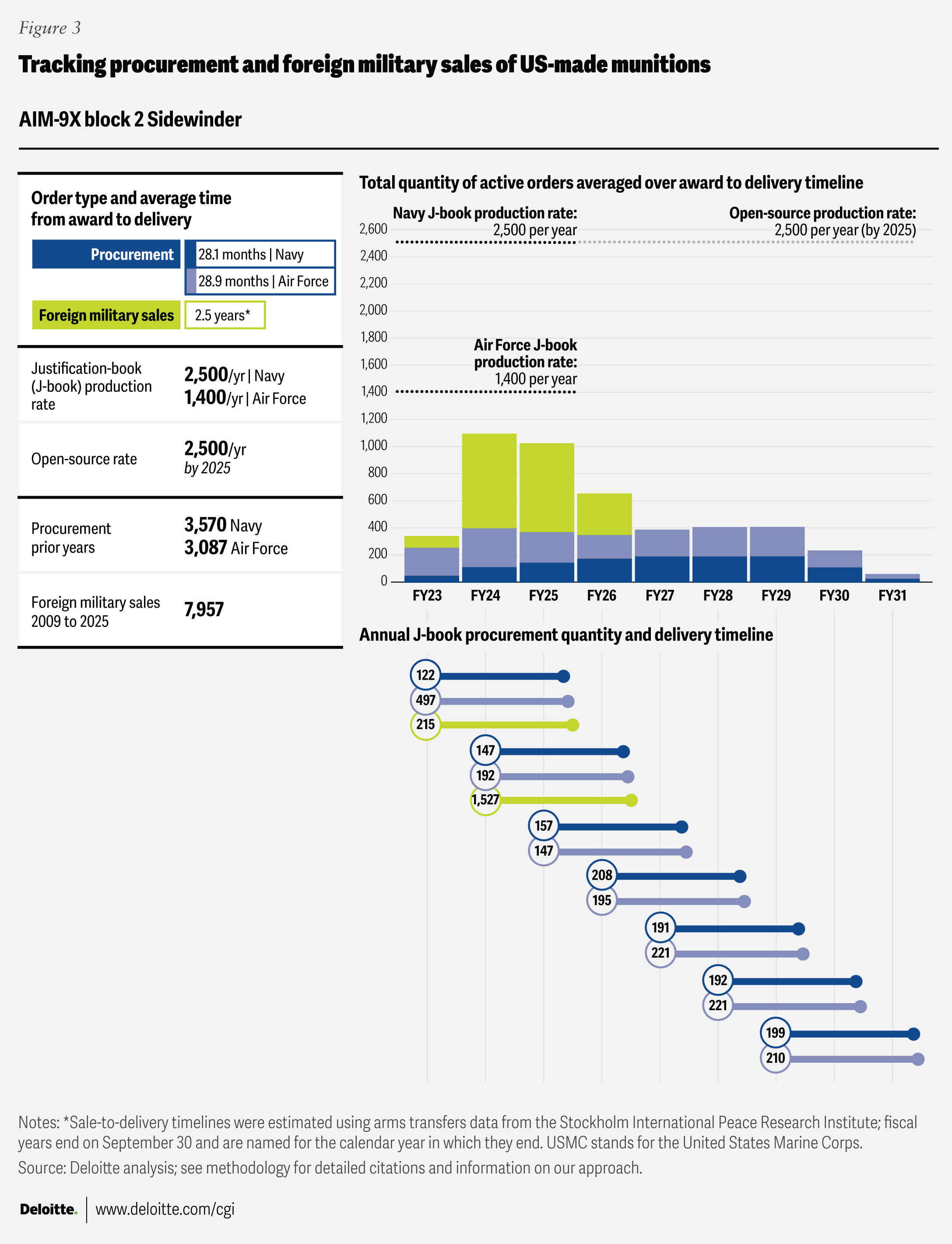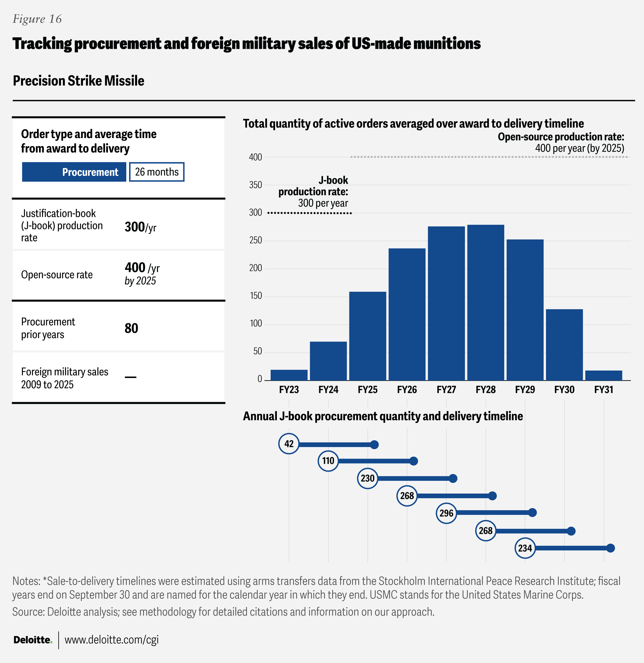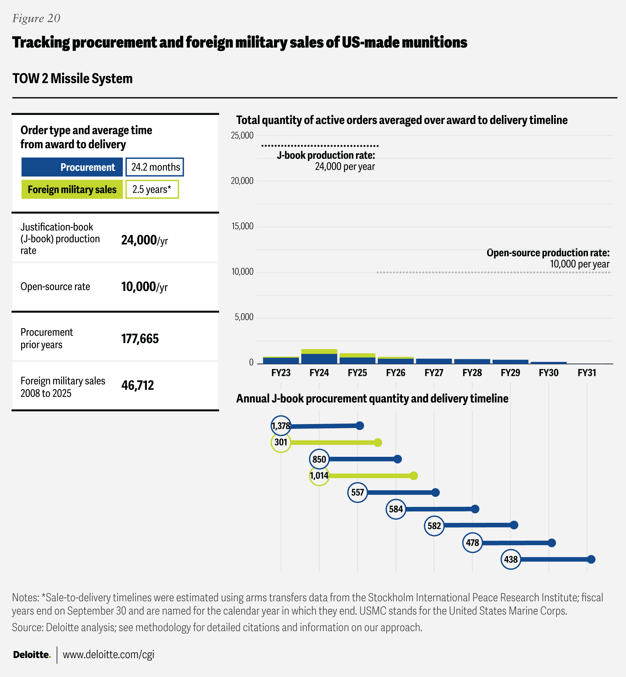 Where “open-source production rates” are cited, the figures come from publicly available sources listed in the endnotes section. Foreign military sales quantities were drawn from the Defense Security Cooperation Agency, and average foreign military sales award-to-delivery timelines were calculated using data from the Stockholm International Peace Research Institute’s Arms Transfers Database. Blank fields indicate that no data was available in the relevant J-book or other open-source references.