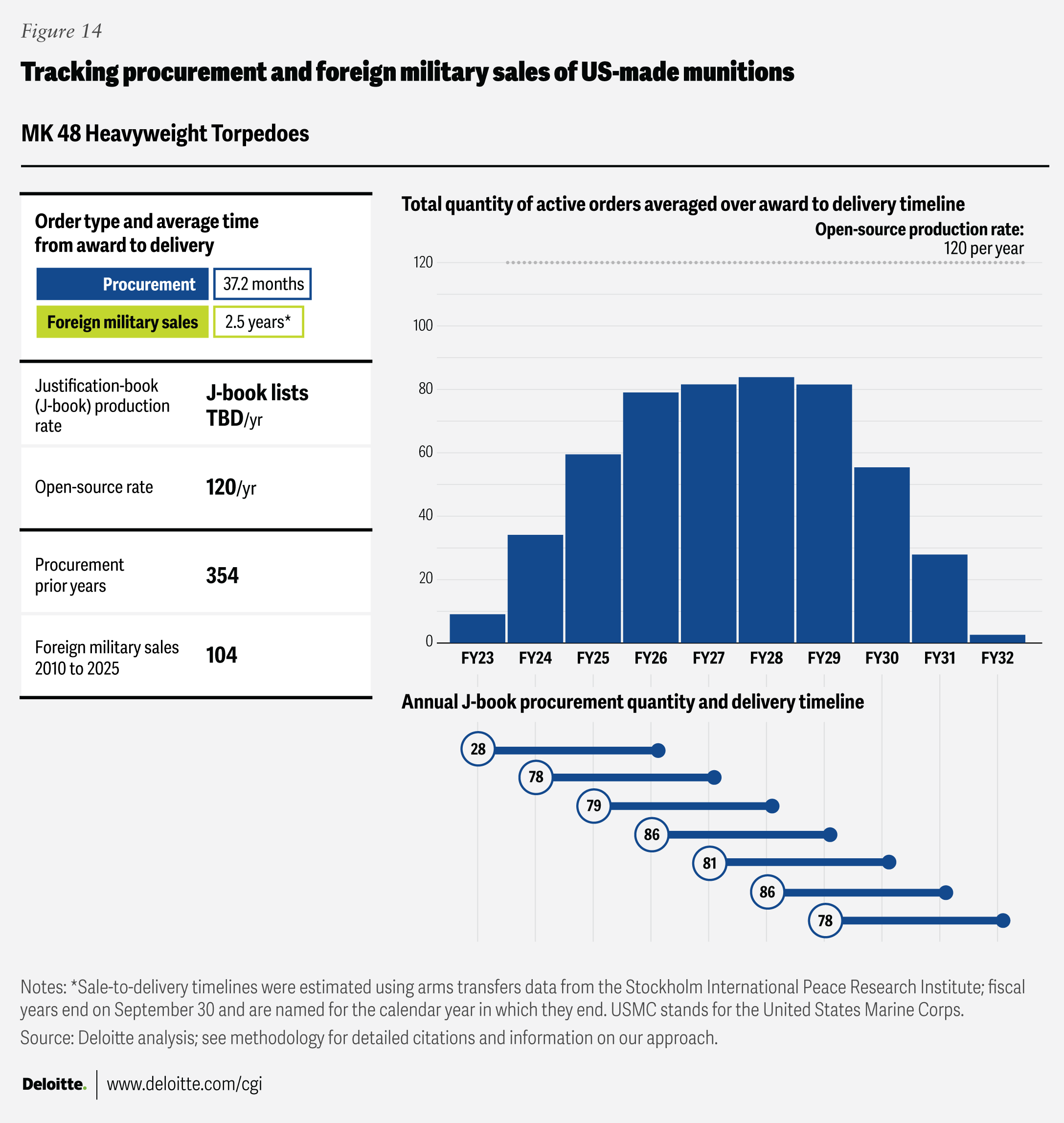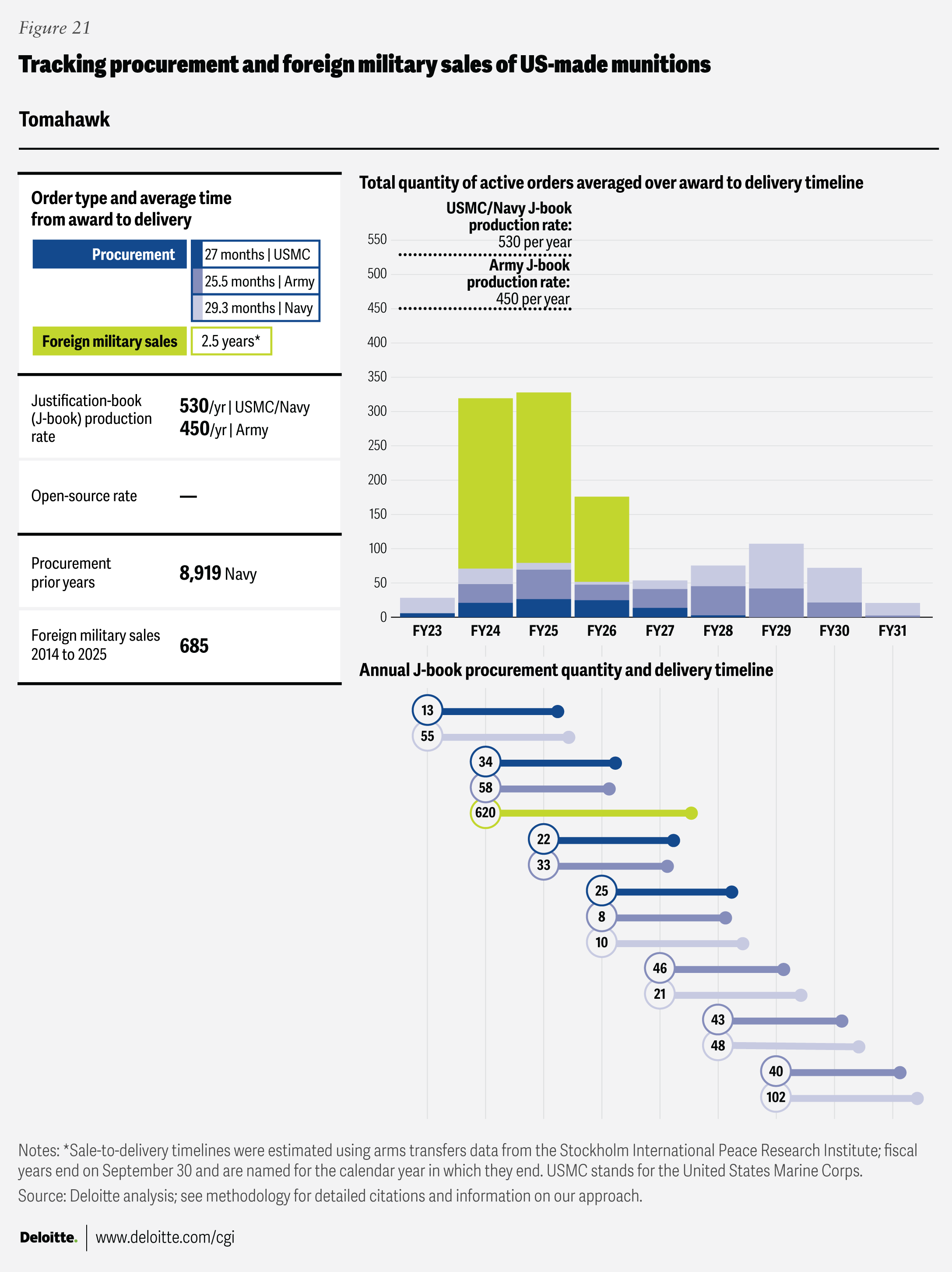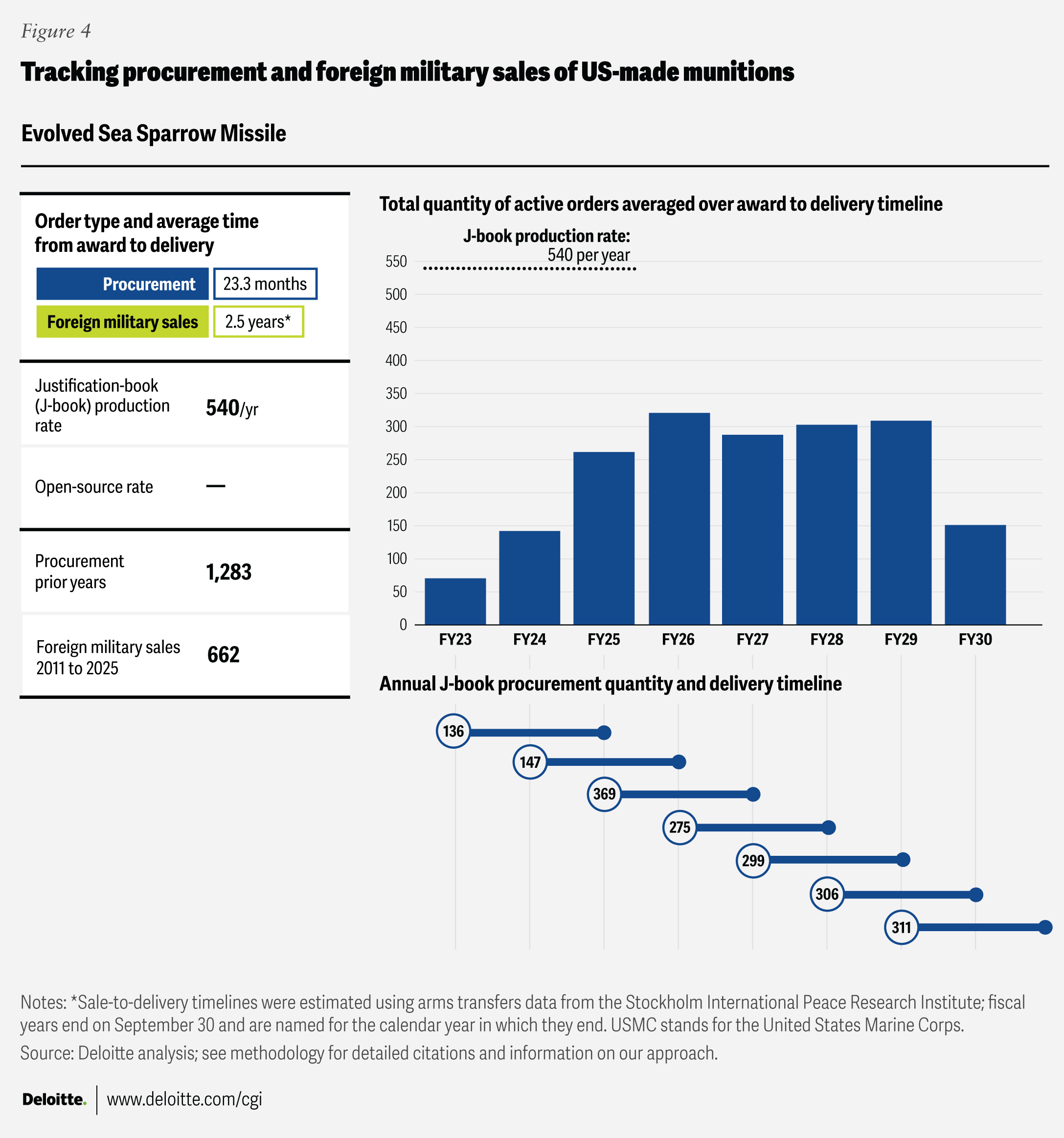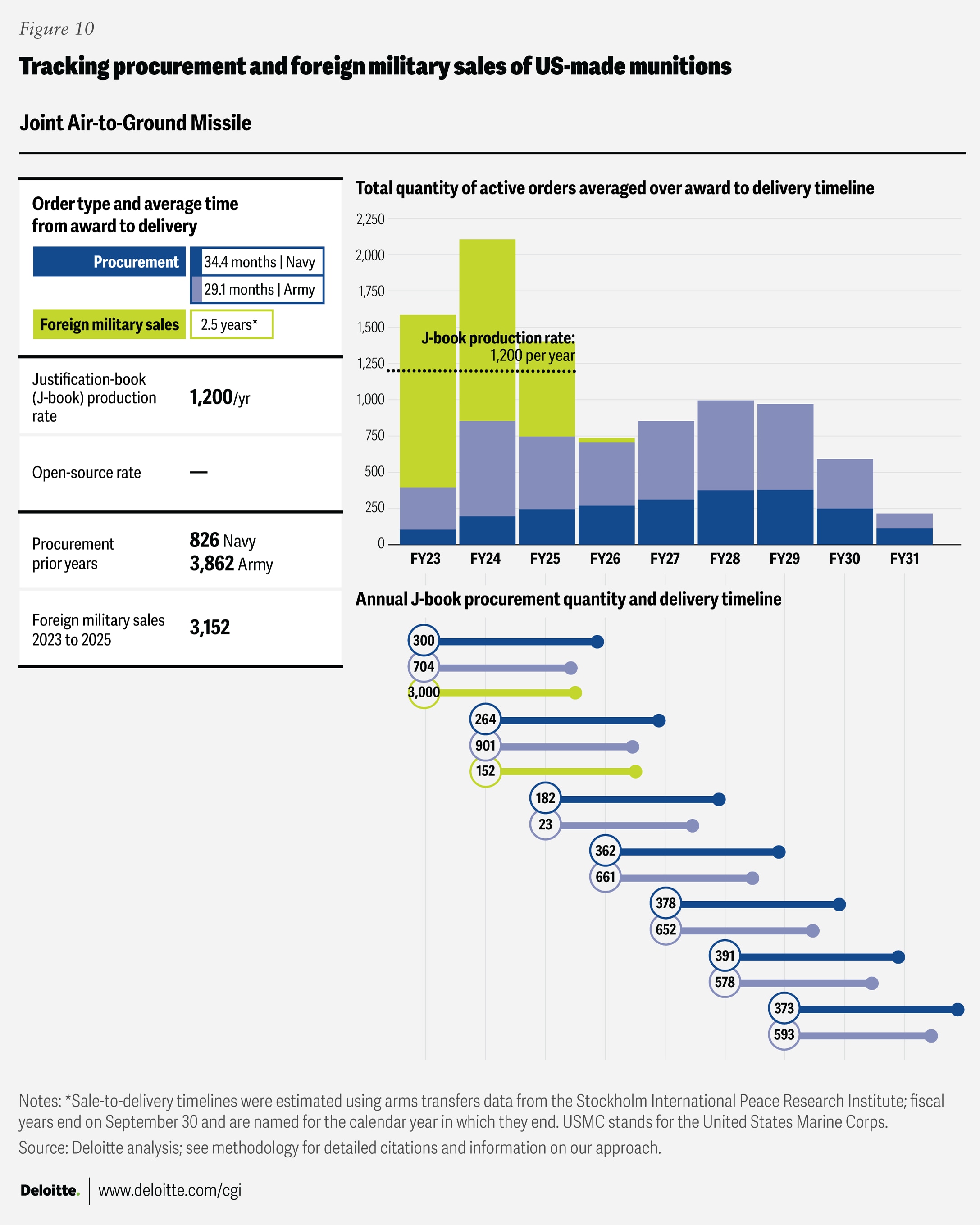 Where “open-source production rates” are cited, the figures come from publicly available sources listed in the endnotes section. Foreign military sales quantities were drawn from the Defense Security Cooperation Agency, and average foreign military sales award-to-delivery timelines were calculated using data from the Stockholm International Peace Research Institute’s Arms Transfers Database. Blank fields indicate that no data was available in the relevant J-book or other open-source references.