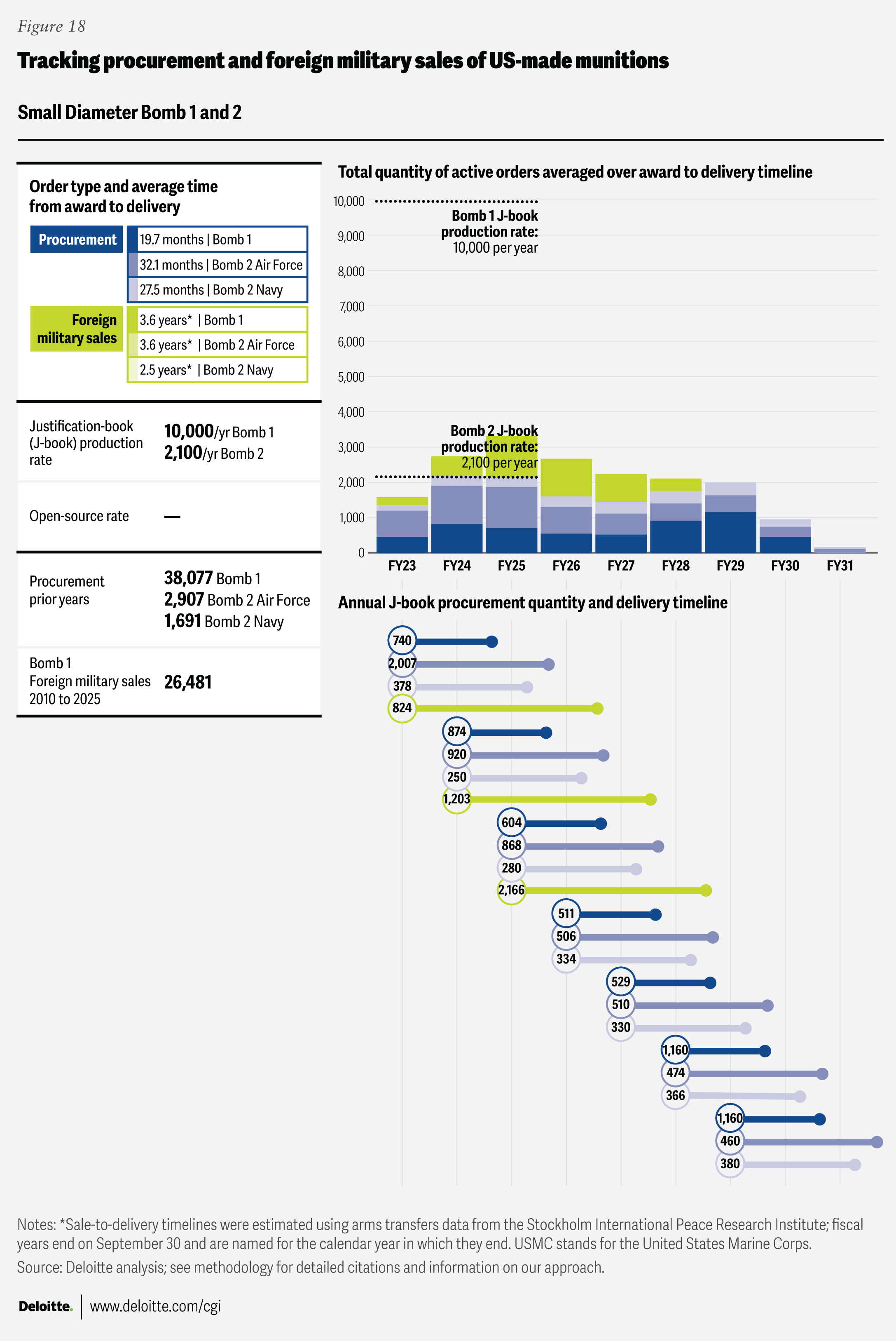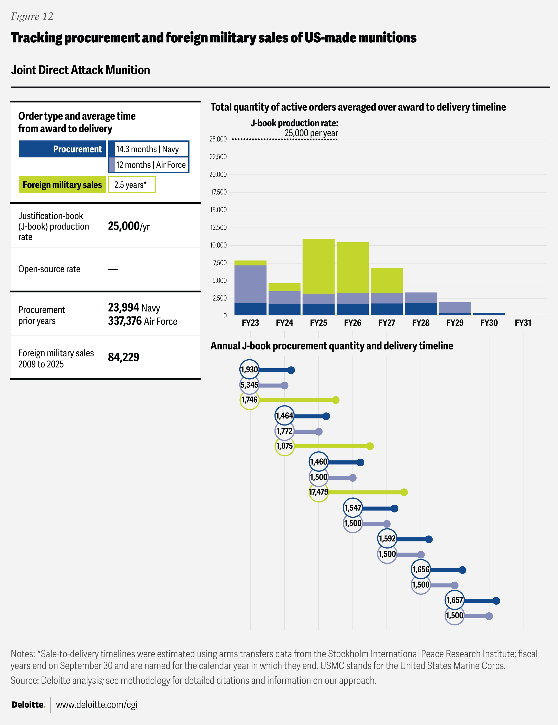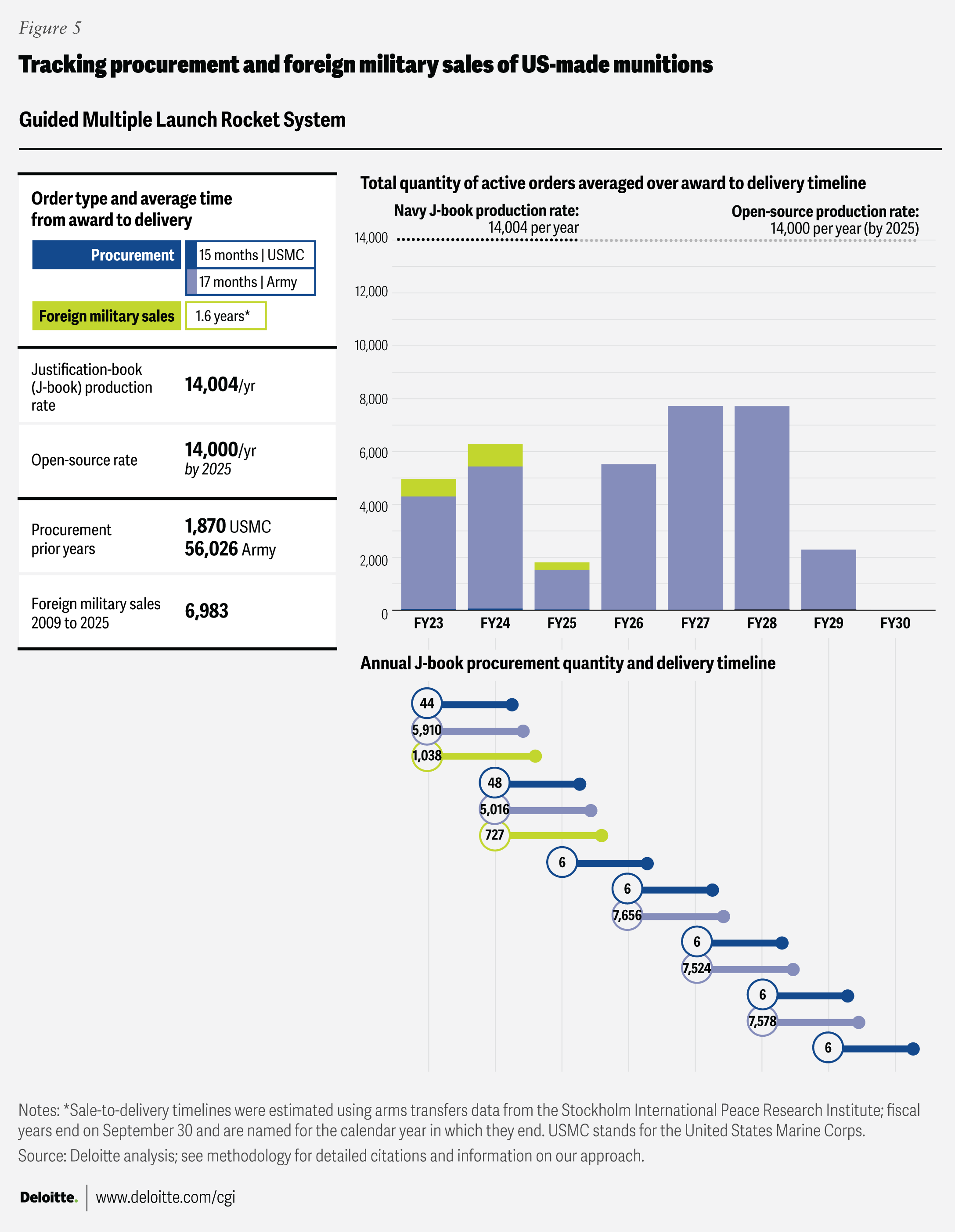 To help illuminate some of the activities shaping the defense industrial base, the Deloitte Center for Government Insights compiled this open-source data into charts tracking procurement and foreign sales across 21 types of munitions. The resulting charts organize and visualize this data to show trends in demand and production over time. Because the Department of War plans and production targets can shift due to policy or budgetary changes, these charts are intended as a baseline snapshot. We plan to update them as new information becomes available. They are intended to inform ongoing discussions about munitions production and defense industrial base resilience by providing a clearer empirical foundation, not to advocate for specific policies or programs. For further details on sources and methods, please see the full methodology section below.