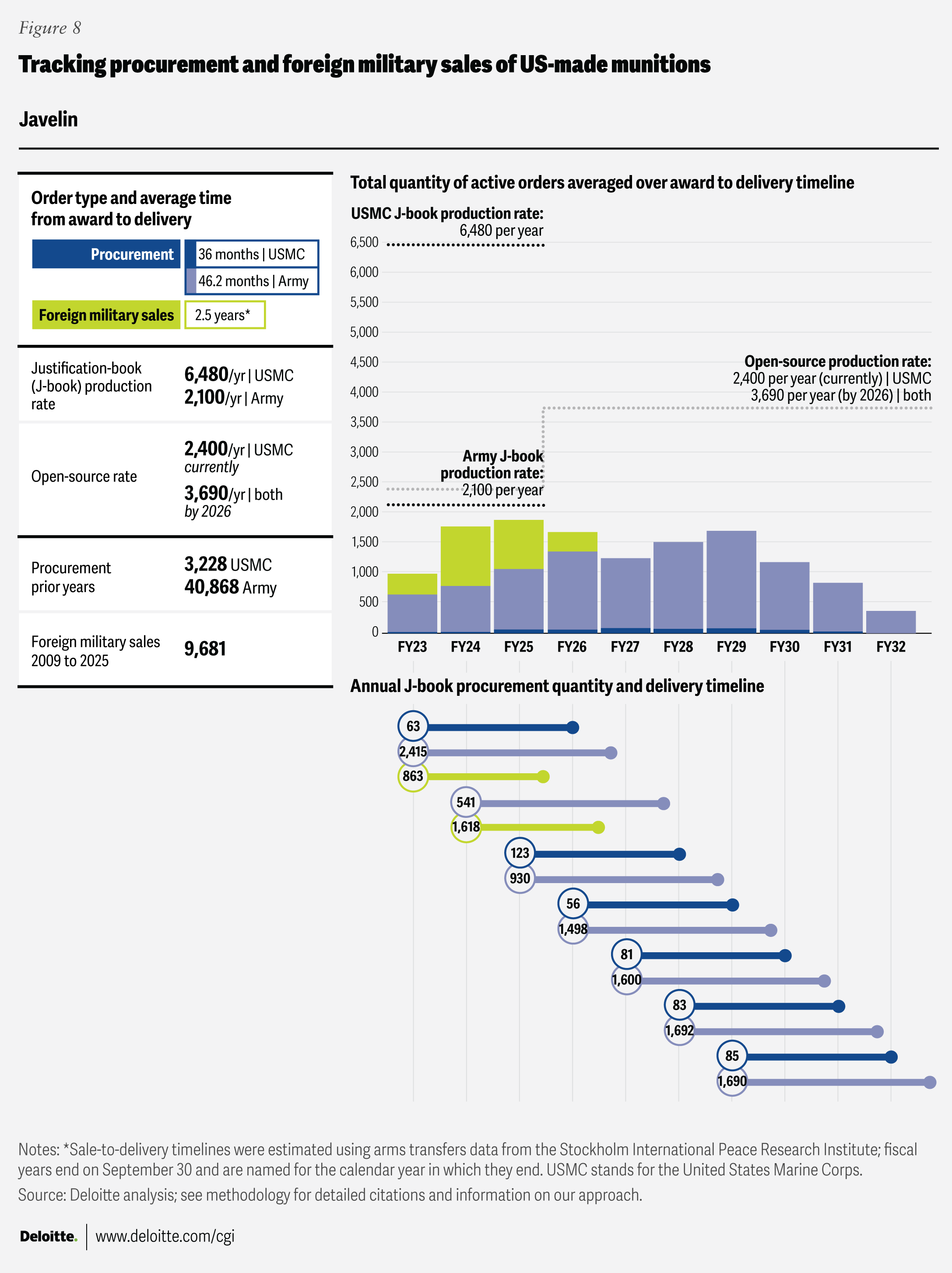 The average time from contract award to delivery for US procurements was calculated using J-book Exhibit P-5a in the Department of War’s President’s Budget 2025 (PB25) Justification books. Award-to-delivery timelines are often impacted by, among other things, operational requirements, contract structures, testing, manufacturing capacity, production efficiency, and fiscal choices (for example, single- vs multiyear awards and budget constraints). To approximate overall production capacity, the award-to-delivery averages were used to spread total procurement quantities across the delivery window in the chart titled “Total quantity of active orders averaged over award to delivery timeline.” Specific production schedules vary by munition and program.