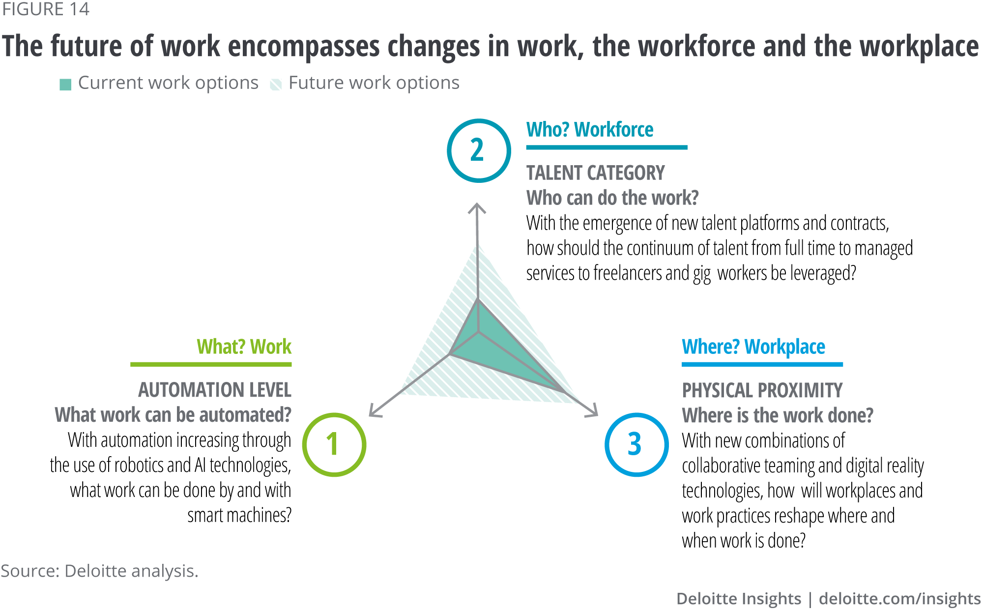 The future of work is being shaped by two powerful forces, the growing adoption of AI in the workplace and the diversification of the workforce to include both ‘on-balance and off-balance sheet’ talent. These forces of change are affecting three deeply connected dimensions of an organisation: the work itself, who does the work and where the work is done (see figure 14). While the full impact that AI technologies will have on the future of work is not yet a foregone conclusion, biopharma companies need to view advances in these technologies as more than merely avenues to drive more efficiency and cost reduction. AI will create opportunities for biopharma companies to redefine roles, activate and reskill their workforce and generate broad and valuable enterprisewide benefits.38