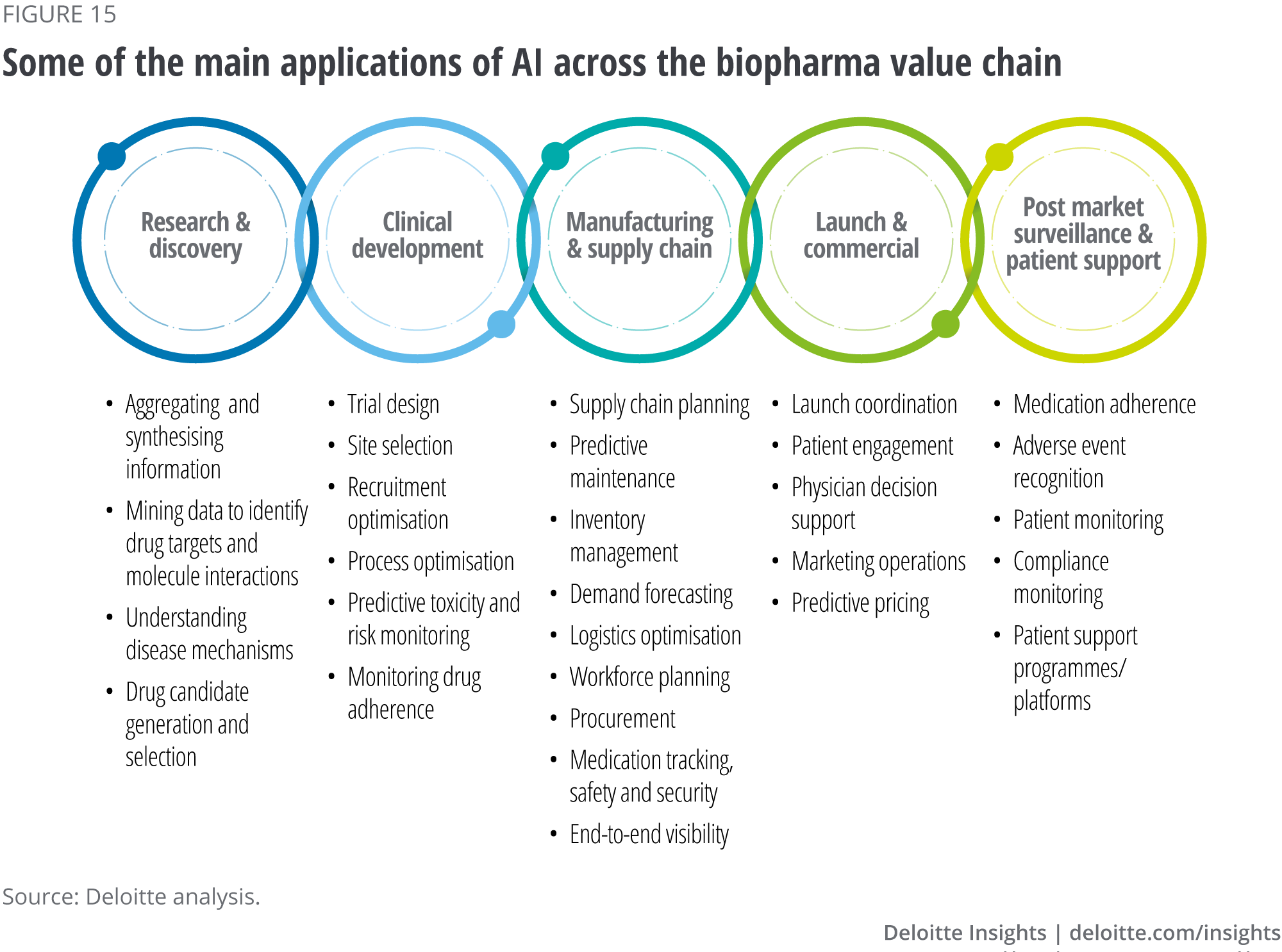 AI’s impact will be felt across the entire biopharma value chain, initially by aggregating and synthesising information from data (see figure 15). Below are examples of the likely applications of AI in the different segments of the value chain.