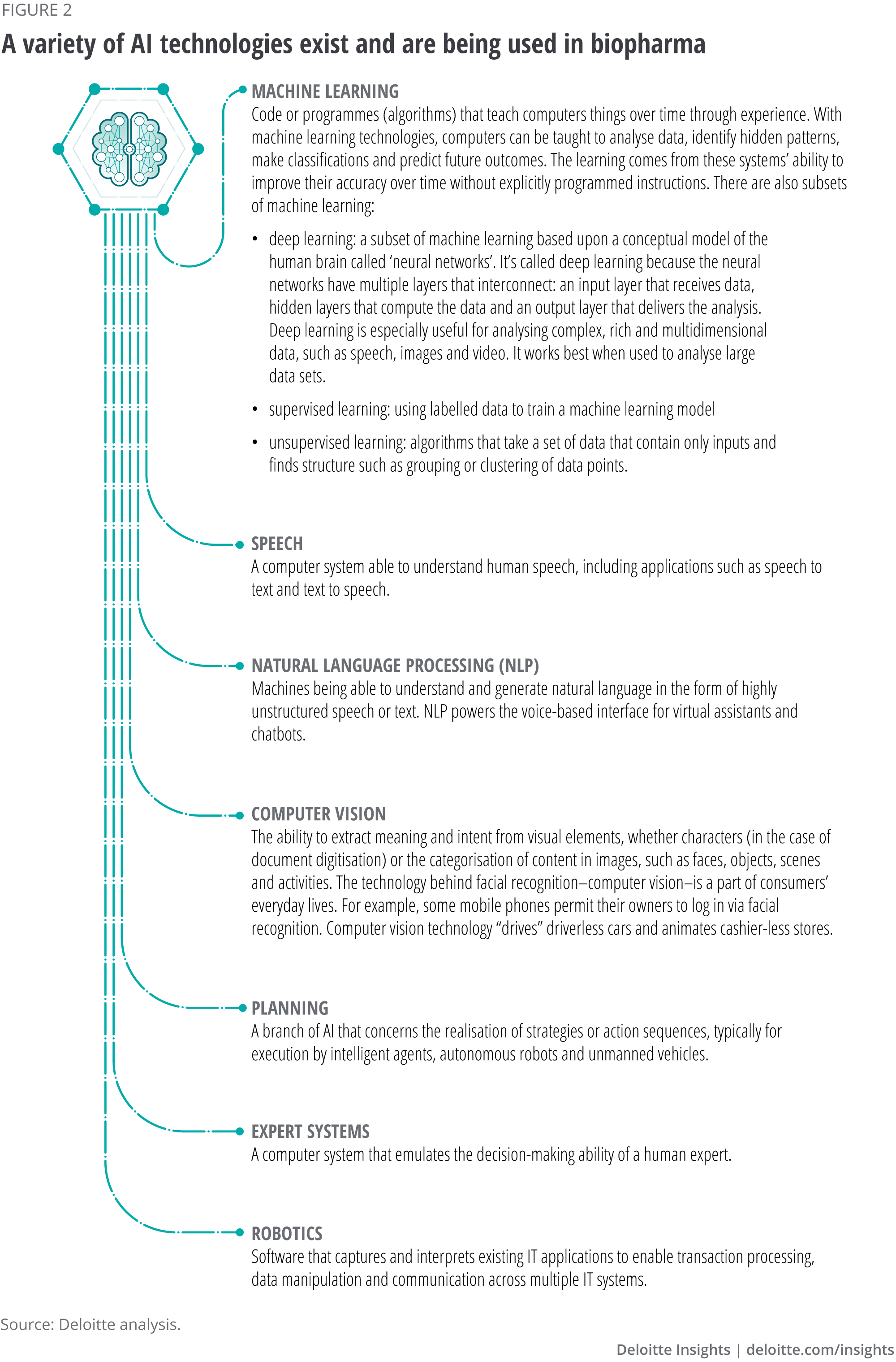 Today, this situation is changing rapidly as early AI adopters such as tech giants and start-ups offer AI-based development tools and applications as products and services, allowing other companies to benefit from AI. Given biopharma’s access to large data sets and the resources to access the required computing power and top technical talent, those companies who are willing to invest early are poised to capitalise on AI.