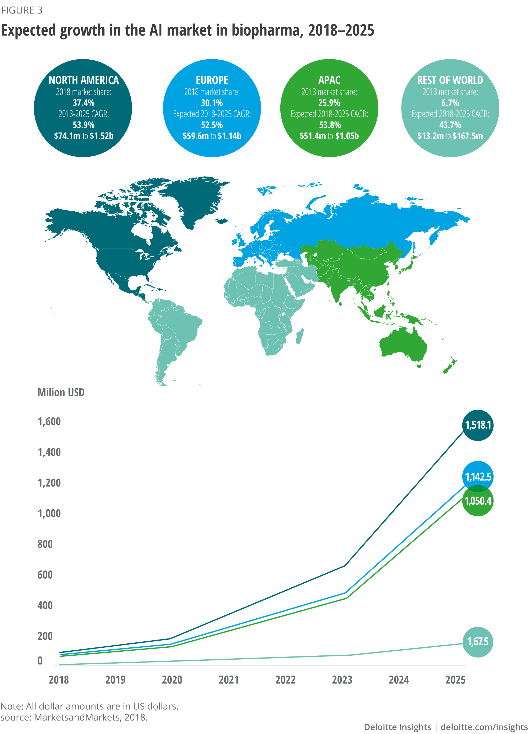 According to MarketsandMarkets, the market for AI in the biopharma industry is expected to increase from US$198.3 million in 2018 to US$3.88 billion in 2025, with a compound annual growth rate (CAGR) of 52.9 per cent.8 These values vary across the four regions: North America, Europe, Asia-Pacific (APAC) and Rest of World (RoW), which includes South America, Africa and the Middle East (see figure 3).