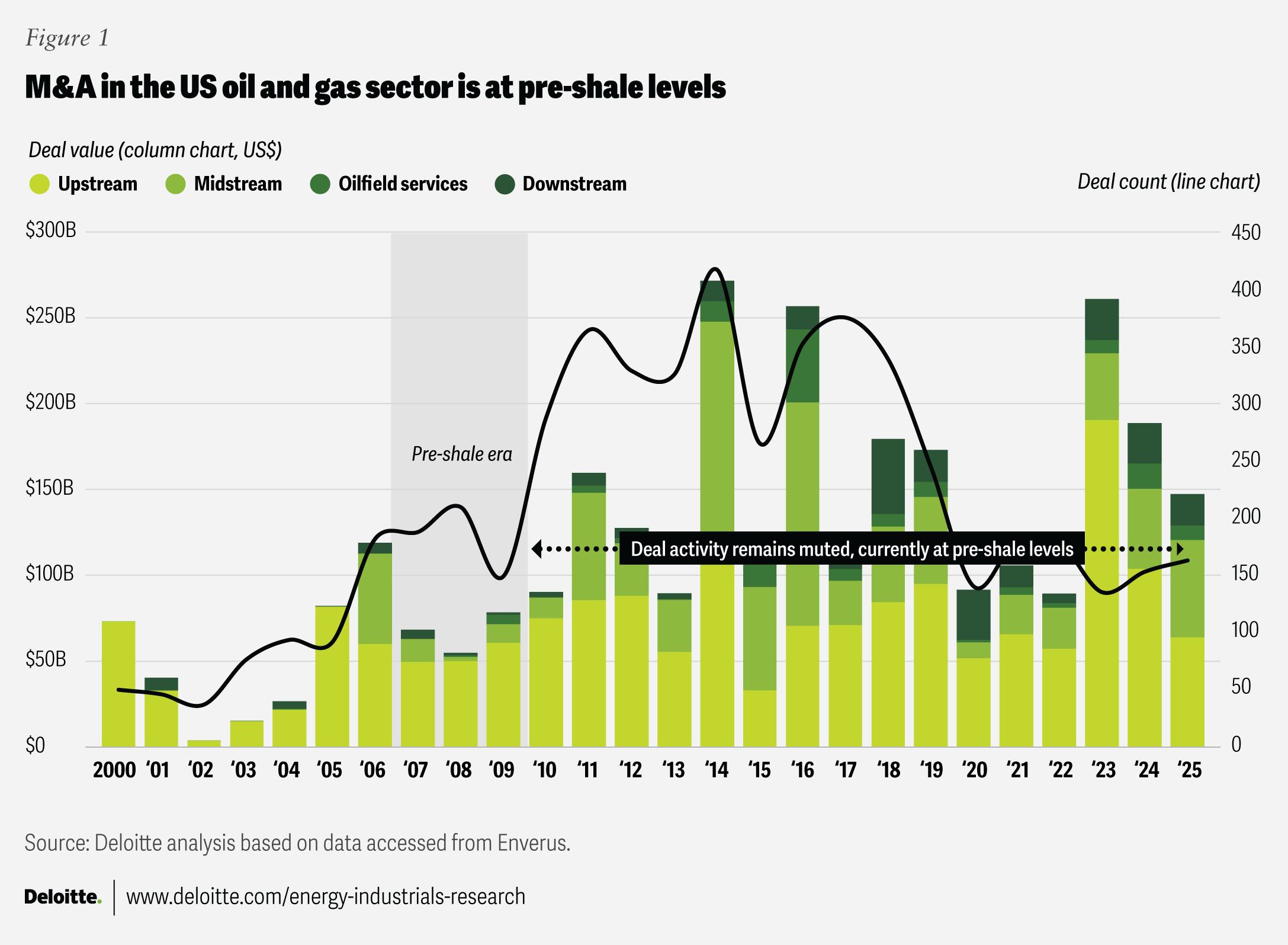 Mergers and acquisitions in the oil and gas industry have hit an inflection point, with traditional drivers such as oil price volatility, reserve replacement, and asset lifecycle management playing a diminished role. Despite some large deals in 2023 and 2024, US oil and gas M&A activity remained subdued between 2020 and 2025. In fact, the 2021 to 2025 average deal value and deal count were about 4% and 44% lower, respectively, than the 2016 to 2020 averages.1 This reflects a shift toward balance sheet strength and portfolio optimization over opportunistic buying, with 2025 deal volumes close to pre-shale levels despite the robust capital markets and supportive policy environment (figure 1).2 Within this landscape, upstream and midstream segments have demonstrated resilience, while oilfield services and downstream sectors have experienced relative weakness.