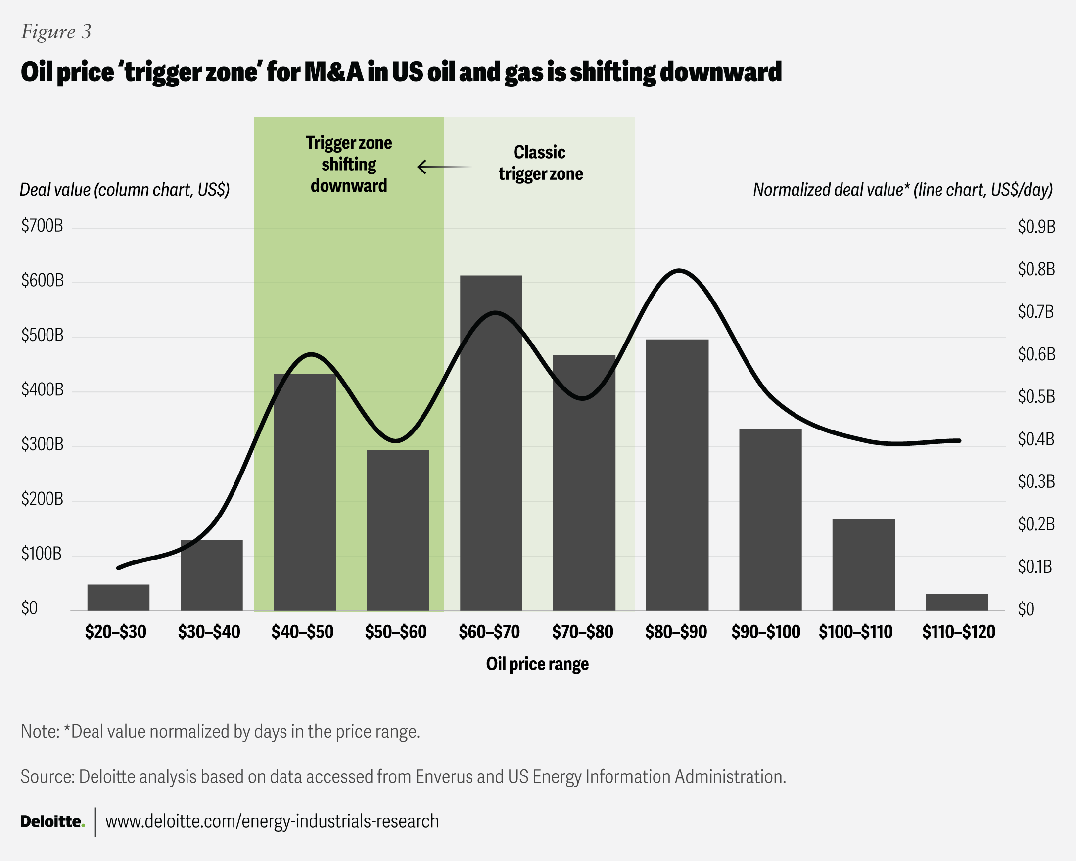 A review of 25 years of oil and gas M&A data reveals that deal activity accelerates when crude prices (West Texas Intermediate) fall into the US$60 to US$80 per barrel range—buyers’ typical “trigger zone” (figure 3). While M&A has at times remained robust above US$80/bbl, such periods are increasingly uncommon and misaligned with current market fundamentals, particularly in the downstream.6 With current prices at around US$60 to US$65 per barrel—both within the trigger zone and below the long-term average of US$75 per barrel—historical data suggests M&A activity should increase if prices hold steady at this level.7