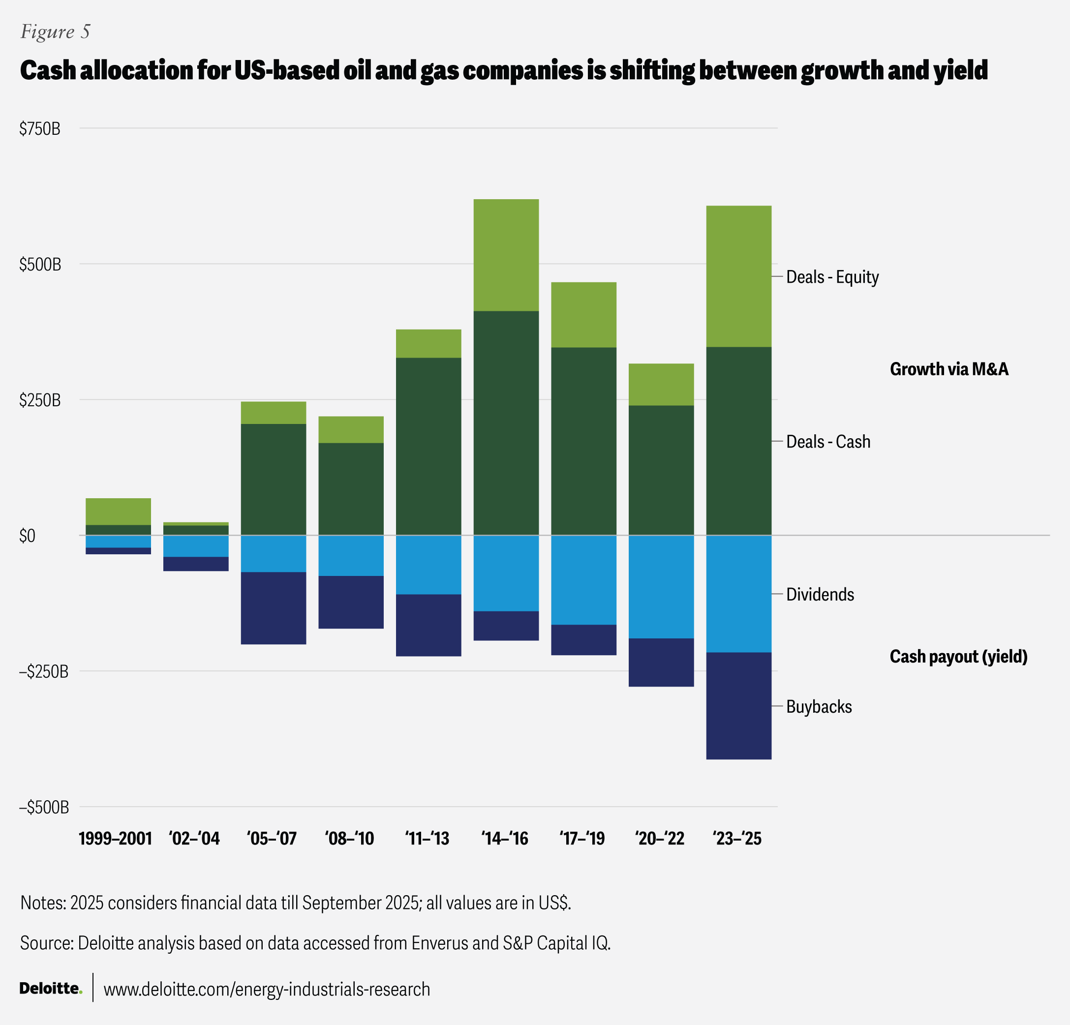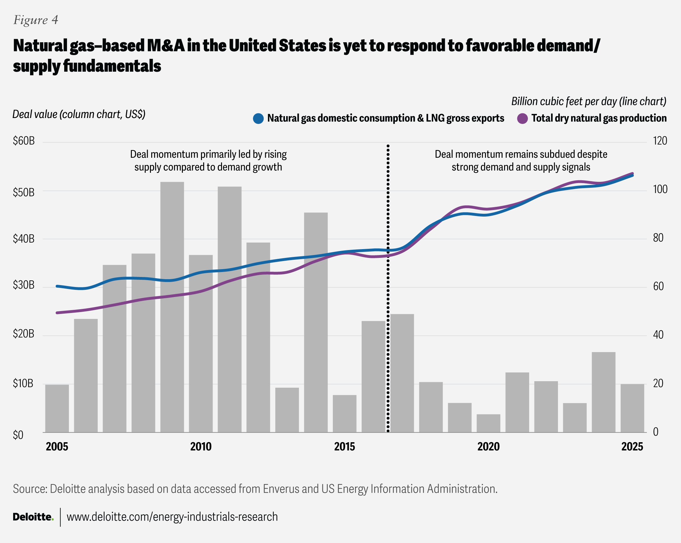 But there’s been a distinct shift since 2015, especially in recent years. Surging demand from data centers, robust growth in LNG exports (expected to have grown 25% year over year in 2025), and corresponding expansion in production and midstream infrastructure are supporting natural gas prices and deal economics (figure 4).12 Yet amid these seemingly strong buy signals, gas-related M&A remains subdued, totaling just US$55 billion since 2021—the lowest five-year figure in two decades.13