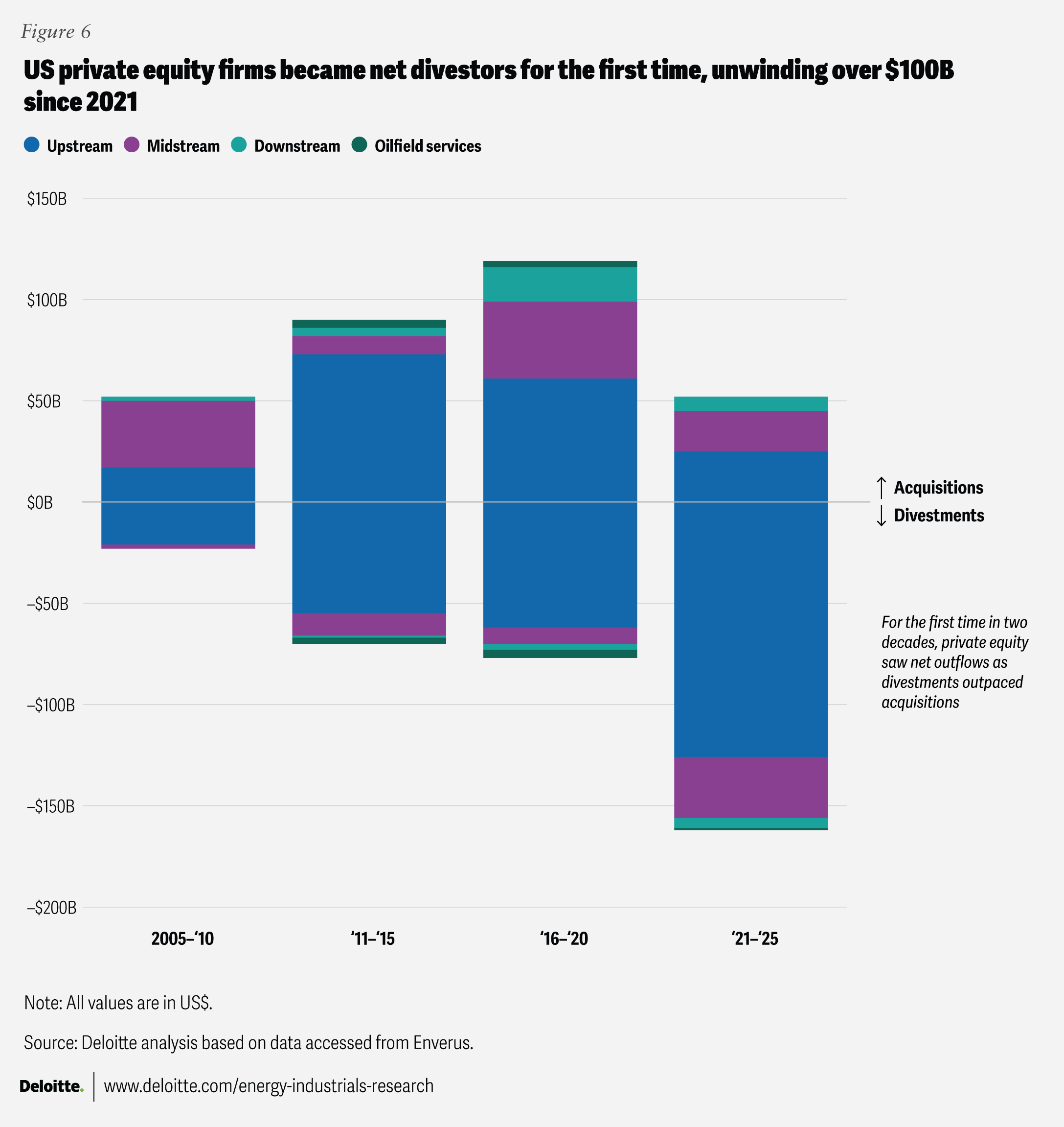 Lately, this capital cycle has reversed from inflows to outflows (figure 6). Between 2021 and 2025, PE sponsors have divested over US$100 billion in assets, driven by softer demand growth, rising near-term supply, fewer attractive low-cost opportunities, and expectations of continued supply strength that supported timely exits. Upstream-focused activity peaked in 2023, when almost US$27 billion in Permian assets were sold.19 Over the past few years, divestiture activity has shifted toward midstream, as PE firms are now reshaping portfolios toward scalable, export-oriented strategies. This is reflected in about US$8 billion in net divestitures of oil and gas distribution assets and roughly US$2 billion in net acquisitions in pipelines serving export terminals and national transport corridors between 2024 and 2025.20