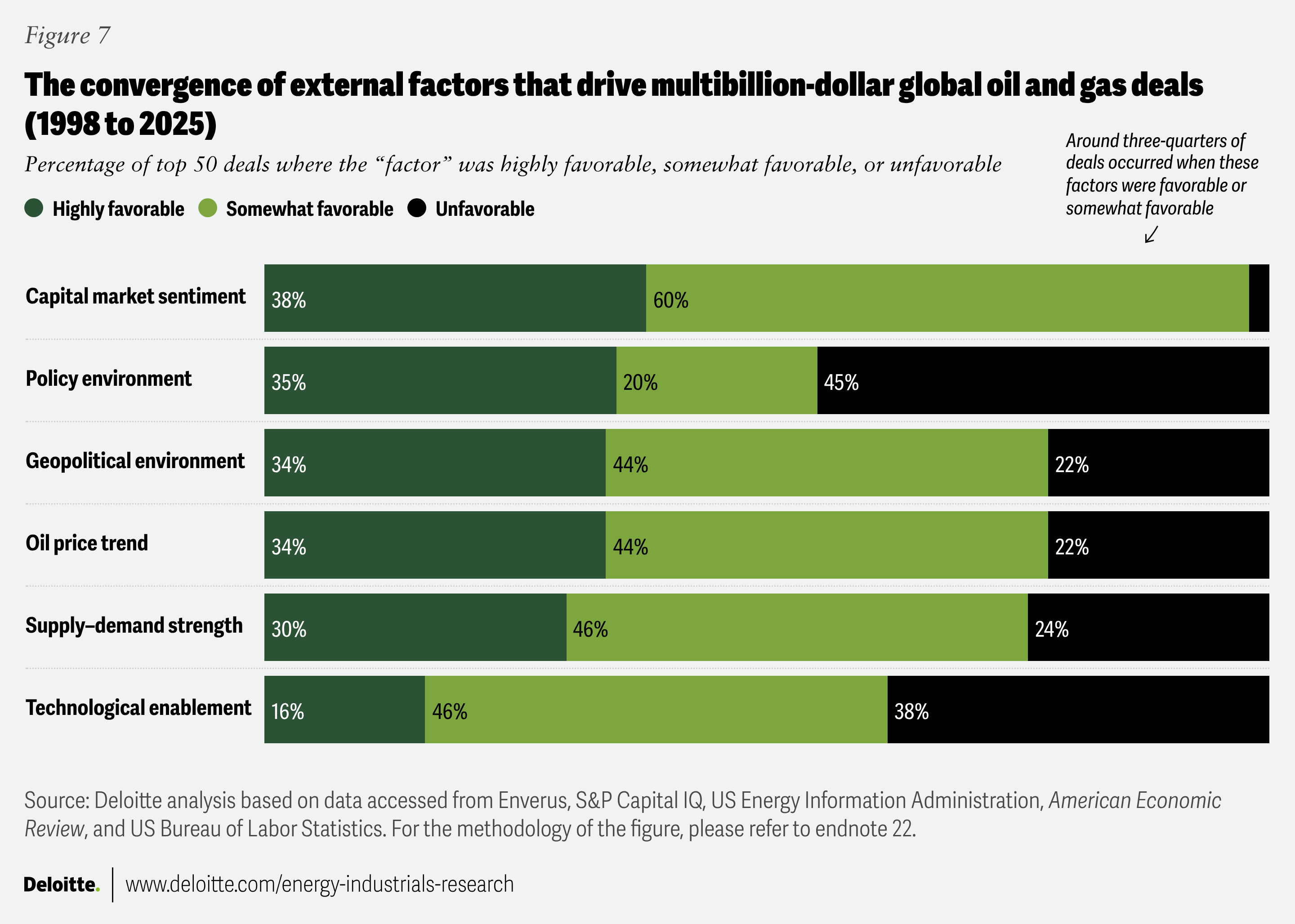 Given the scale of capital and assets at stake, companies considering megamergers closely monitor external conditions before acting. They evaluate oil prices, equity and credit markets, supply-demand dynamics, technology shifts, policy stance, and geopolitics. In our review of the top 50 global O&G deals, about 75% occurred when these factors were favorable or somewhat favorable (figure 7).22 Nearly 70% coincided with strong equity markets, stable oil prices, and major technological advancements, notably the shale revolution.23 The largest transactions, averaging US$35 billion to US$40 billion, typically occurred when multiple external factors were highly favorable, and timing advantages were clear.24