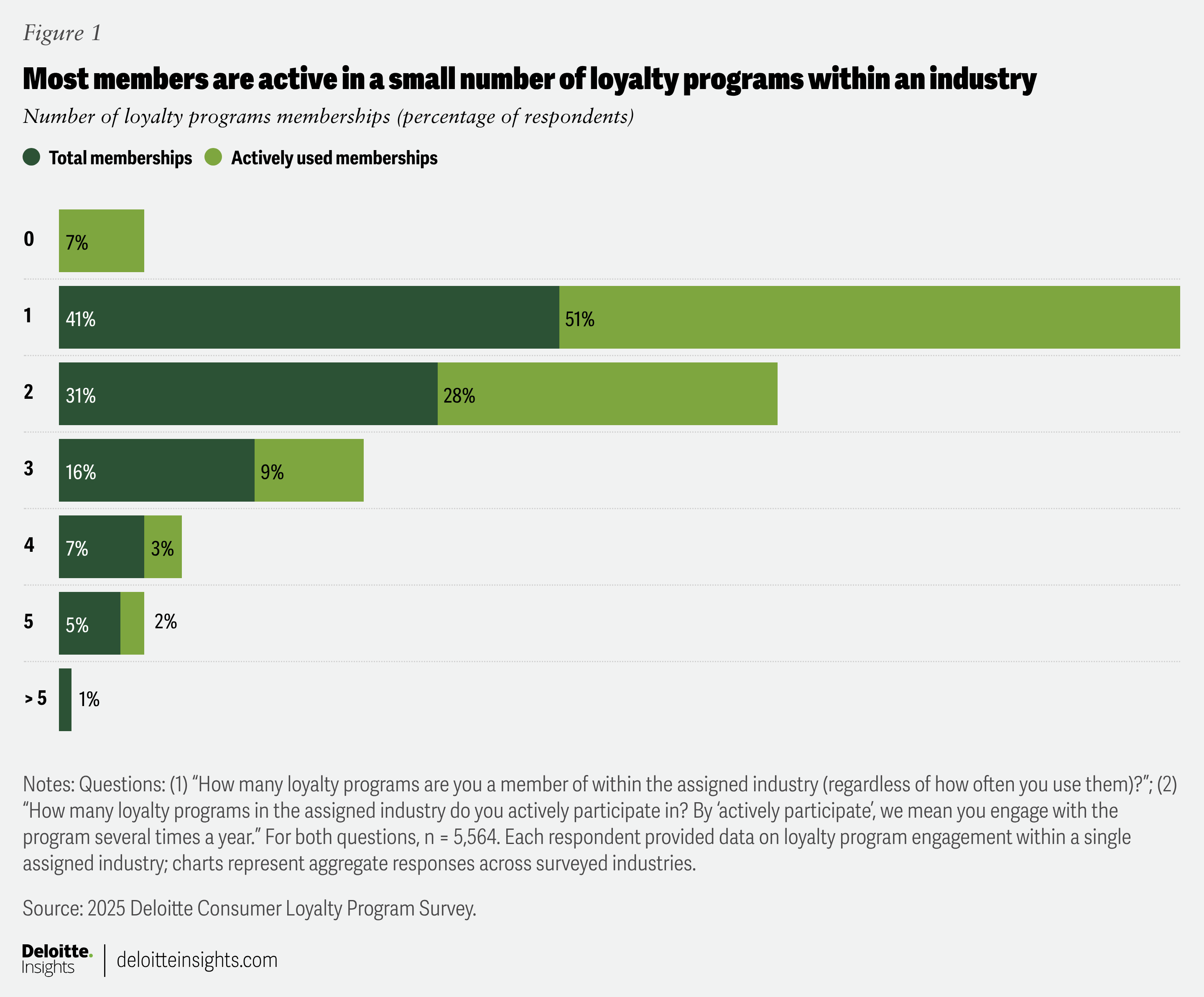 The 2025 Deloitte Consumer Loyalty Program Survey collected data from 5,564 US adults (18 years and over) who are loyalty program members. The survey, conducted from September to October 2025, was developed by Deloitte and conducted online by an independent research company. Respondents were assigned to one of seven major consumer-facing industry groups, represented by 14 underlying sectors. Industry quotas were managed at the group level, while sector samples contributed to industry-level results. The sample included airlines (n = 683); hotels (n = 679); restaurants (n = 681, including fast food and coffee shops, and casual dining); grocery, convenience, and drug stores (n = 812, including grocery stores, convenience stores, and pharmacy and drug stores); club stores (n = 675); mass retailers (n = 678); and department stores and specialty retailers (n = 1,356, including department stores, home goods and electronics stores, health, beauty, and wellness stores, apparel and footwear stores, and sports, leisure, and hobby stores).
