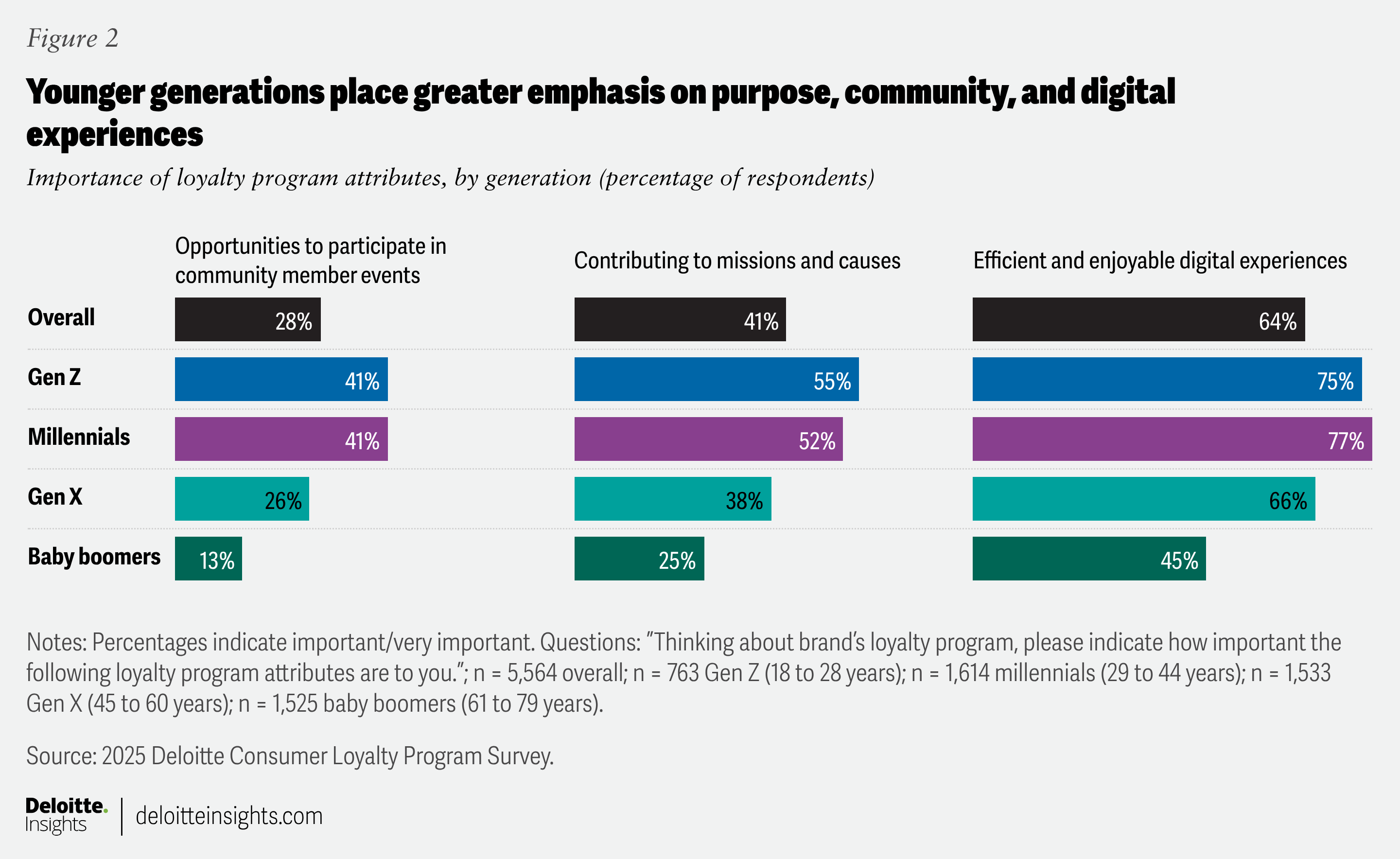The preferences for loyalty programs are also changing across generations. For example, Gen Z and millennials are placing greater importance on contributing to missions and causes, opportunities to participate in community member events, and efficient and enjoyable digital experiences (figure 2). Customized rewards, accelerated earnings, and digital features like real-time tracking are also far more appealing to younger cohorts.7
