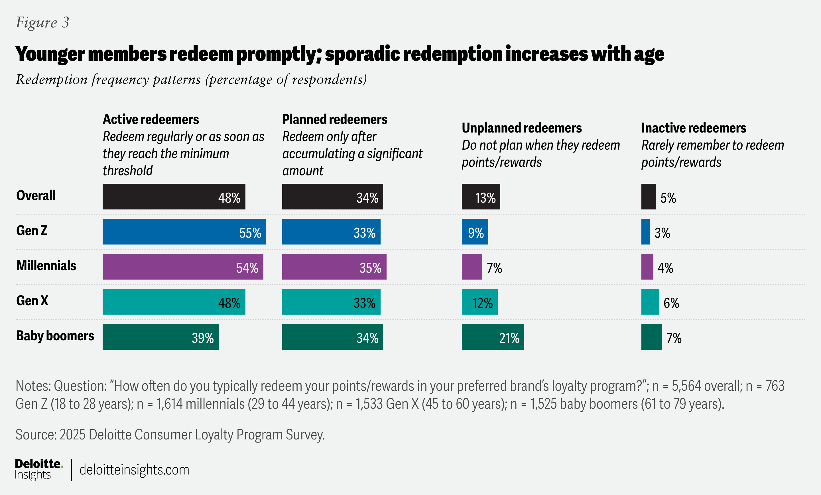 1. Make redemption effortless. While enrollment is widespread, brands have an opportunity to improve engagement levels, especially through user experience. Generational patterns reveal that younger consumers are more likely to redeem rewards promptly, while unplanned redemptions are more common among older generations (figure 3). Yet 40% of all respondents admit to sometimes forgetting to redeem, evidence that this is an area for improvement.8 The decisive lever? Transform redemption into a seamless transaction experience that offers clarity, simplicity, and flexibility, and can directly strengthen the perception of reciprocal value.