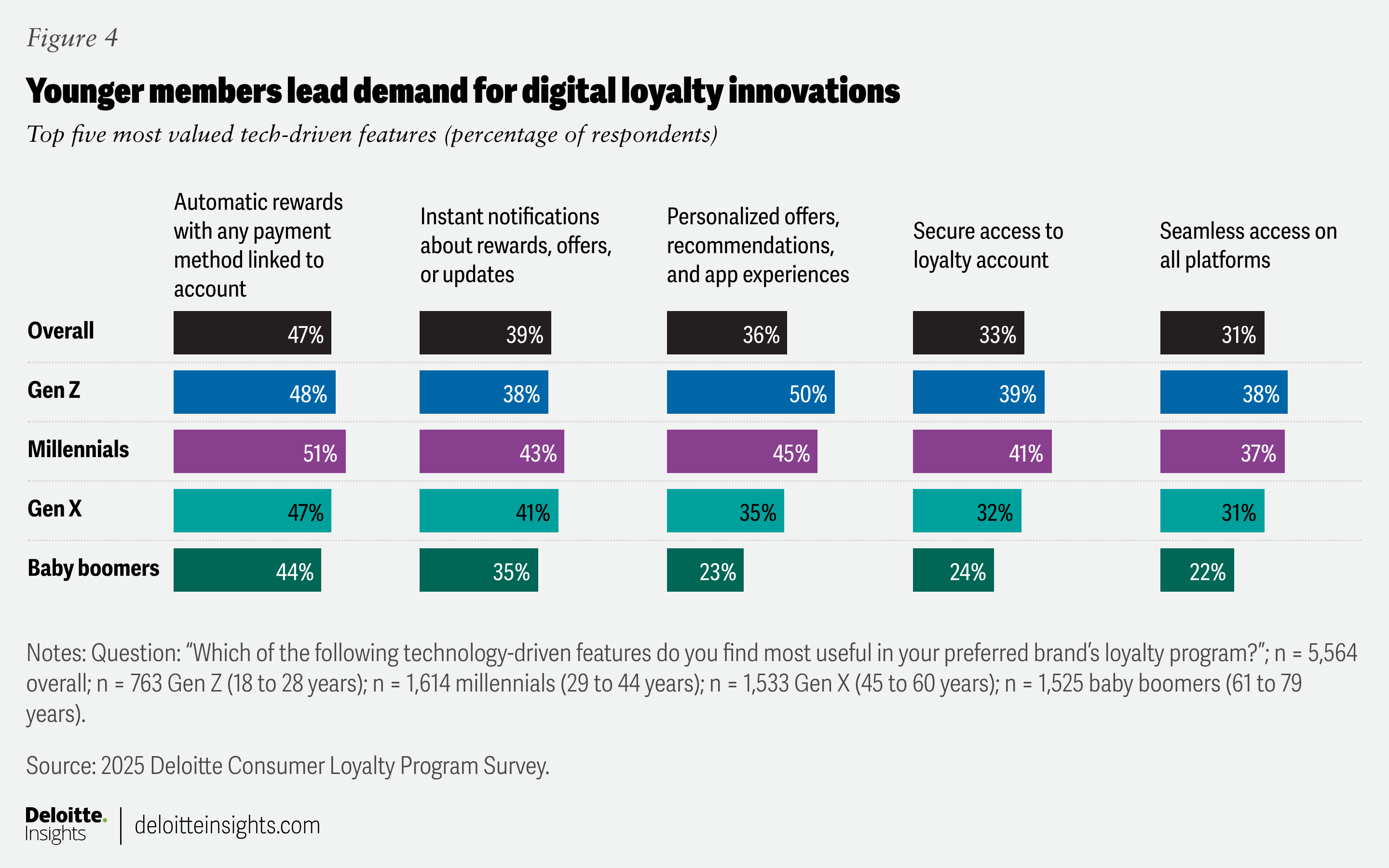 Younger consumers show an especially strong preference for digital enablement. More than 90% of Gen Z and millennial respondents found at least one tech-enabled feature useful, compared with 73% of baby boomers. Their interest is especially pronounced in features like payment integration; instant notifications; and personalized offers, recommendations, and experiences (figure 4). This widening gap suggests that retailers should adapt their digital investments to meet the expectations of emerging customer cohorts while ensuring accessibility for all members. These insights point to a clear opportunity to use digital features to elevate loyalty experiences, improve consistency and remove friction across channels, and simplify value discovery.