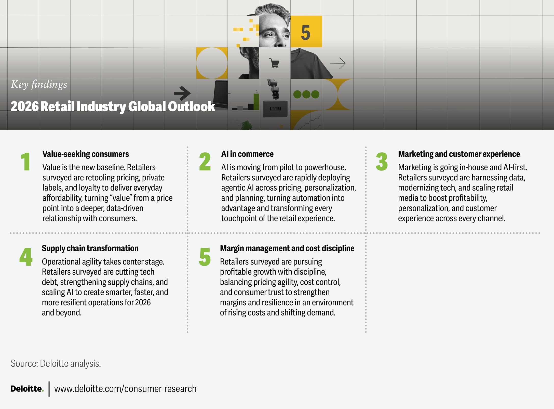 And while those fundamentals still ring true, our recent survey of 330 global retail executives (see methodology) indicates that 2026 could prove to be a watershed moment, forcing retailers to flex their “adaptability” muscles in new and challenging ways. The industry faces significant shifts in commerce, customer engagement, and operational discipline, with artificial intelligence at the core of these disruptions. So, how is the retail world set to respond? Our 2026 outlook explores five dynamics that could shape the year ahead: