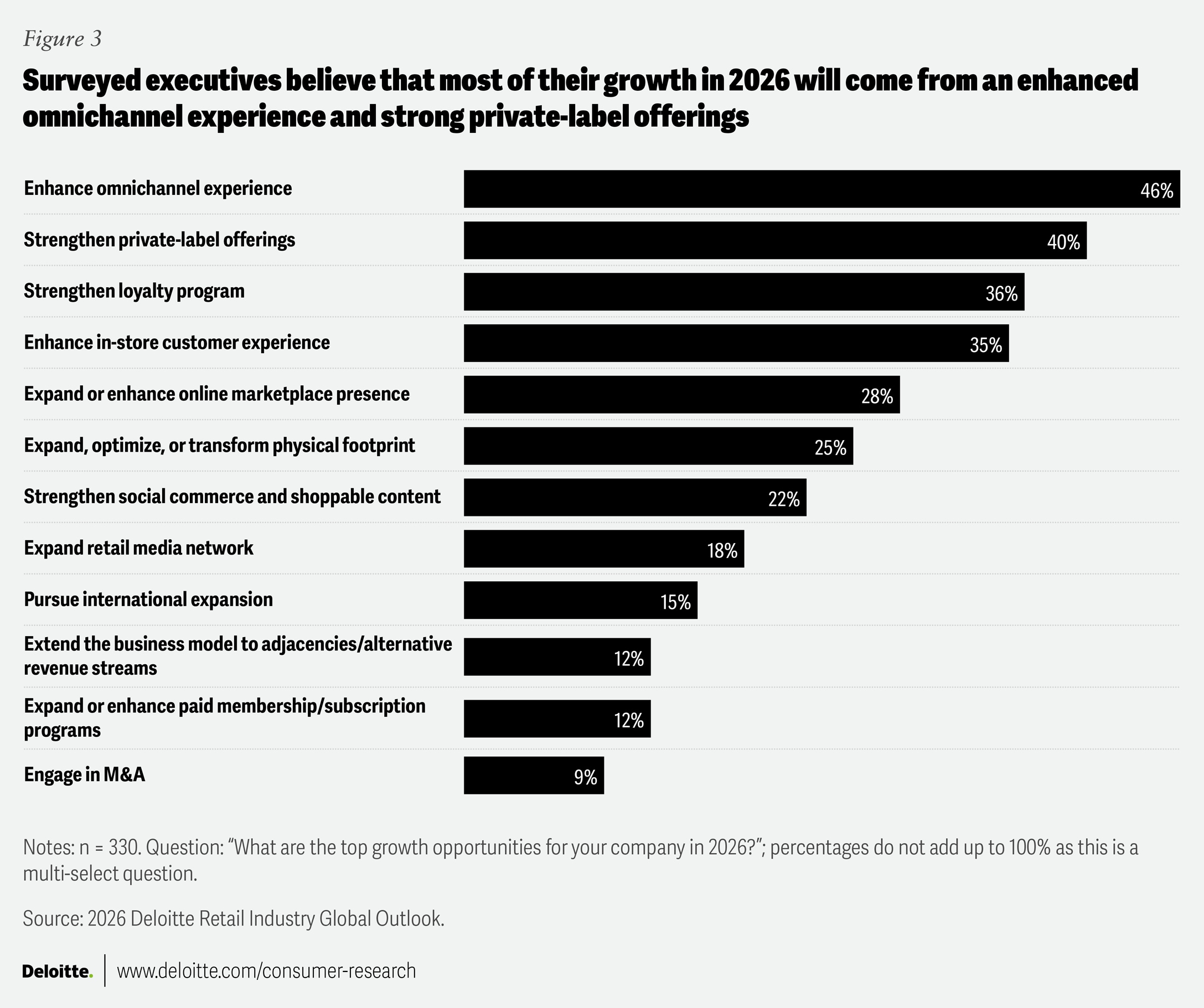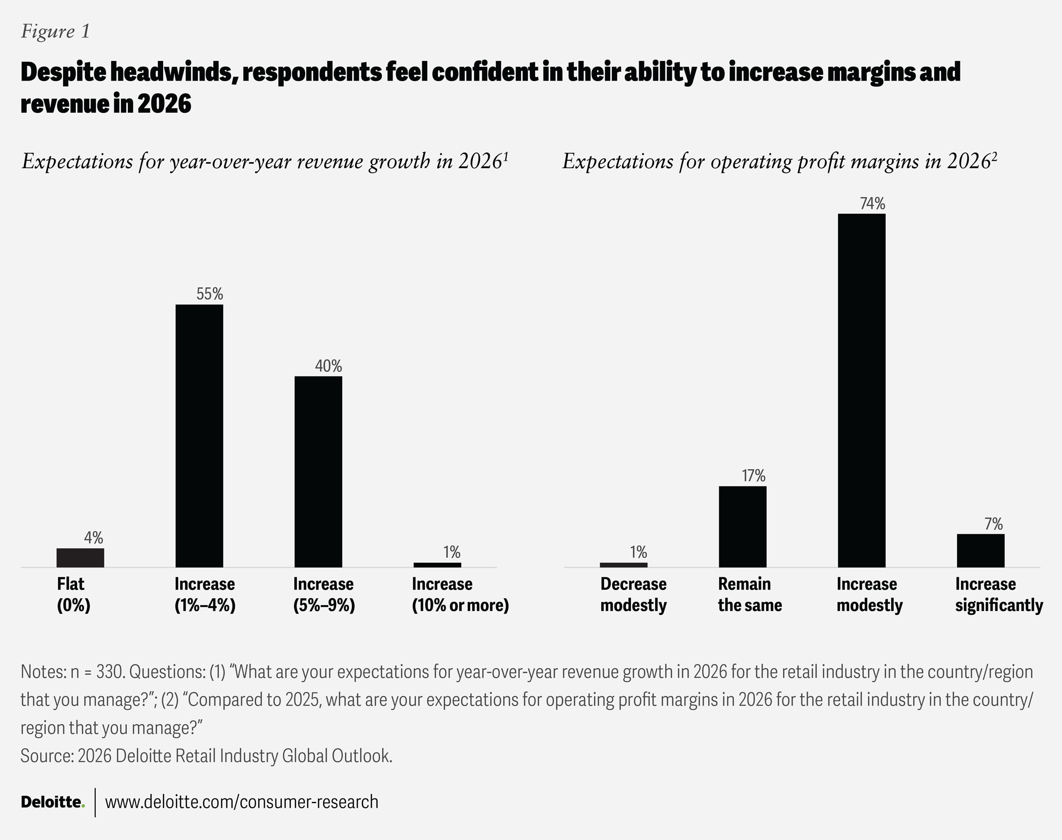 The 2026 Retail Industry Outlook survey was developed by Deloitte and conducted online by an independent research company from Oct. 13 to Nov. 19, 2025. The survey polled 330 executives, with 86% employed at retailers generating at least US$1 billion in annual revenue and 41% at companies with annual revenues of US$10 billion or more. The respondents included C-suite and senior executives who were directly responsible for, or exerted significant influence on, their organizations’ major strategic initiatives.