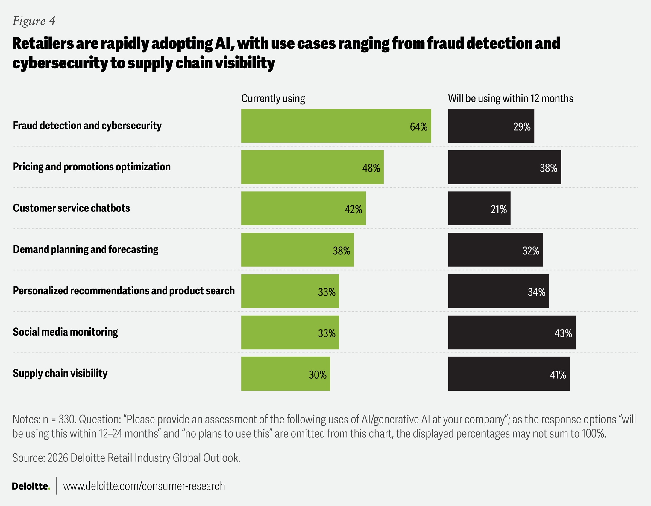 AI’s journey from pilot initiative to the heart of retail operations is accelerating, with an overwhelming majority of retailers either already using, or set to use, AI in the next 12 months for core operational capabilities (figure 4).