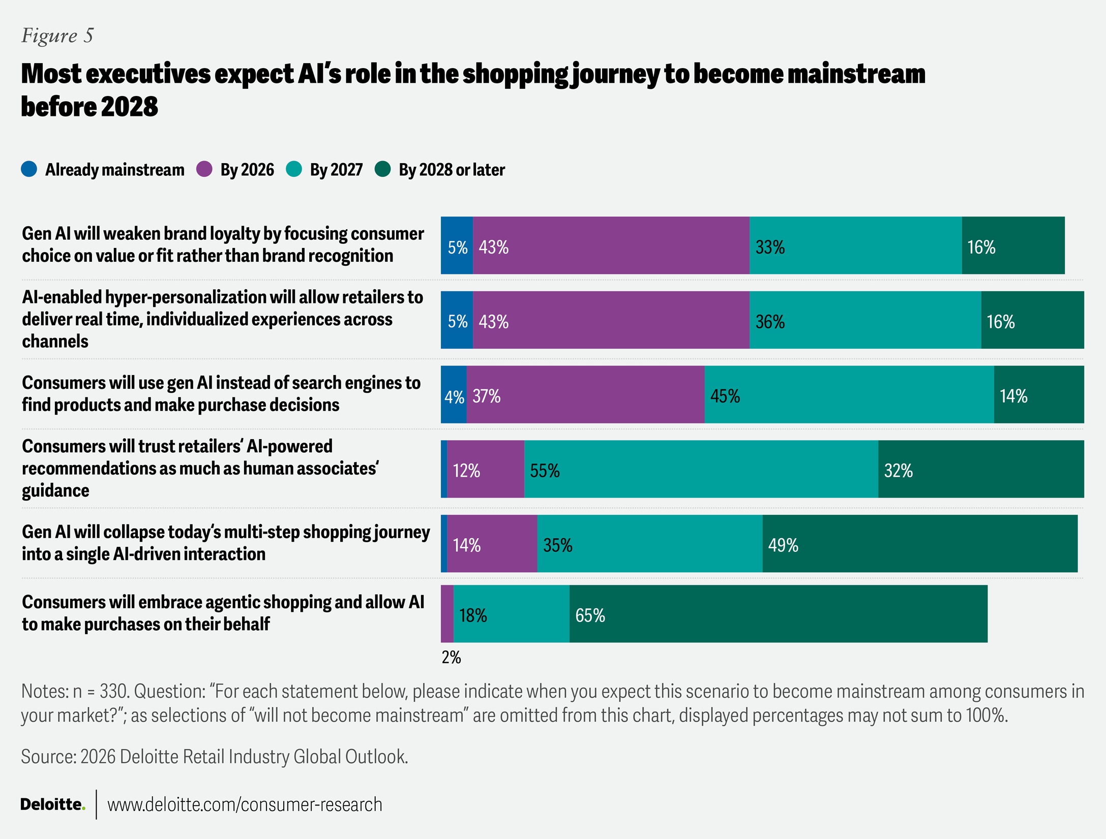 Retail executives are cognizant of the potential disruption—nine in 10 expect AI to be increasingly used over search engines by 2026, while half expect the collapse of today’s multi-step shopping journey by 2027 as shopping moves into a single AI-driven interaction (figure 5).