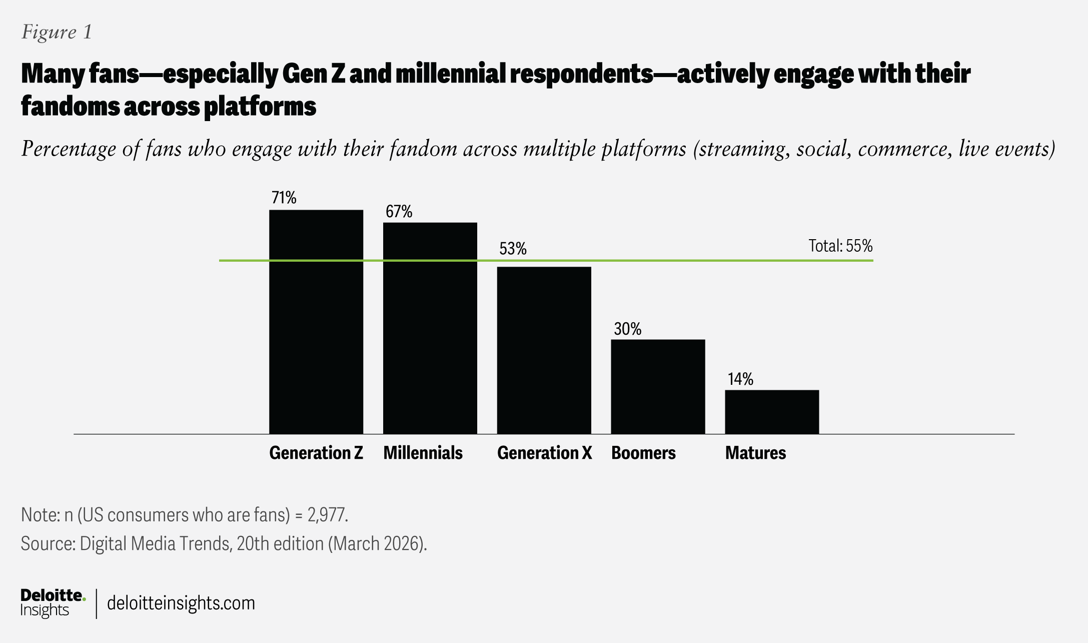 More than half of fans (55%) say that being a fan of a show, artist, or franchise often leads them to engage with it across multiple platforms, spanning streaming services, linear TV, social channels, merchandise, and live events (figure 1). That figure rises to roughly 70% among Gen Z and millennial fans. Creators on social media and online communities are also central to their fan activities: Nearly half (46%) seek out fandom-related content from creators, and the same share (46%) say they’re more likely to engage with entertainment content recommended by their fan community. Fans also report using more social networks (an average of six), compared with nonfans (who use an average of four).