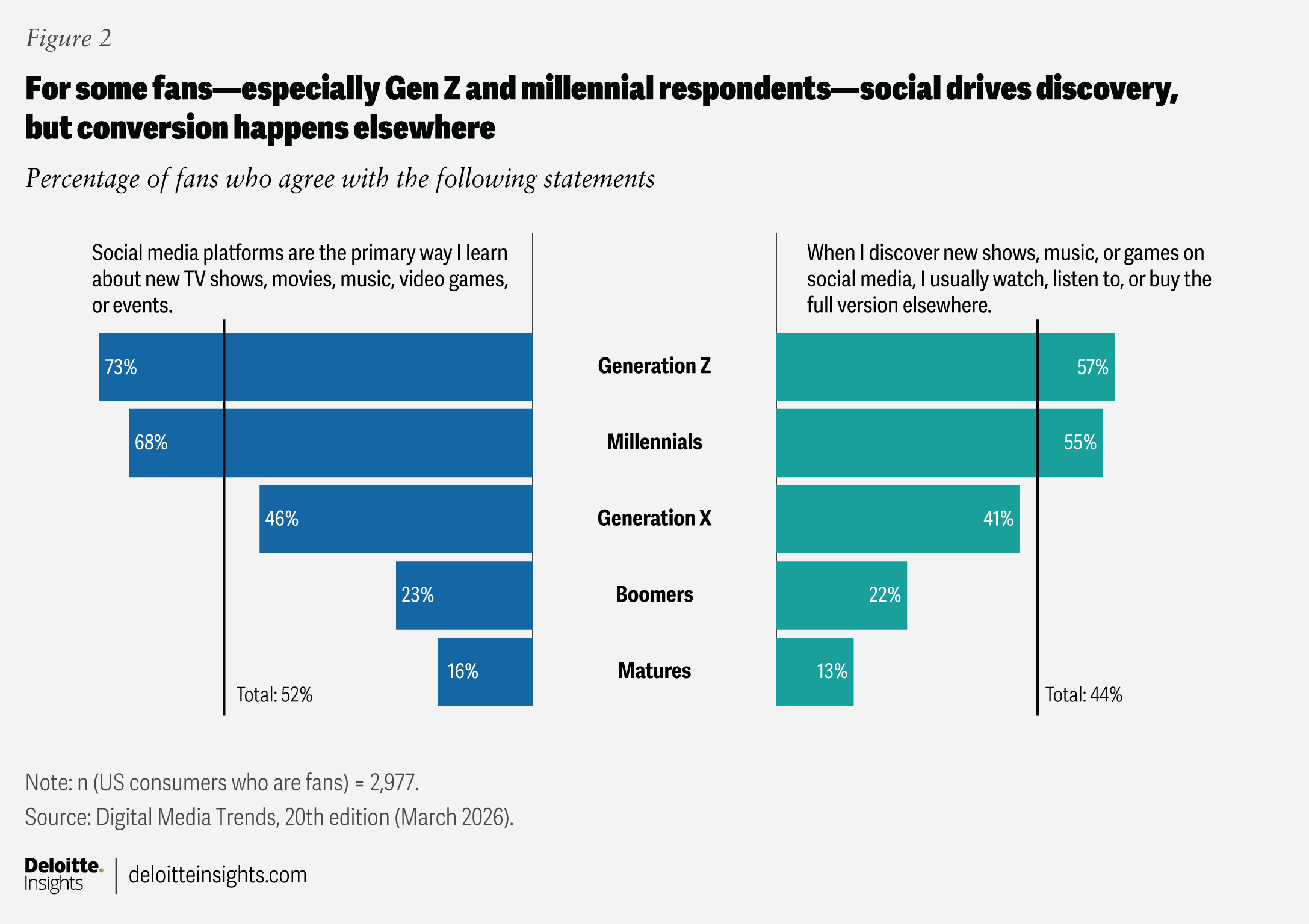 This gap appears early in the engagement process (at the top of the funnel) with discovery. Around half of fans (52%) say that the primary way they discover new content—TV shows, movies, music, video games, or events—is through social media (figure 2). This figure jumps to 73% among Gen Z fans. Creators and user posts drive some of this discovery, but studios and streamers also fuel this trend by leaning on social media for marketing and promotions, as they know that’s where attention and audiences live.9