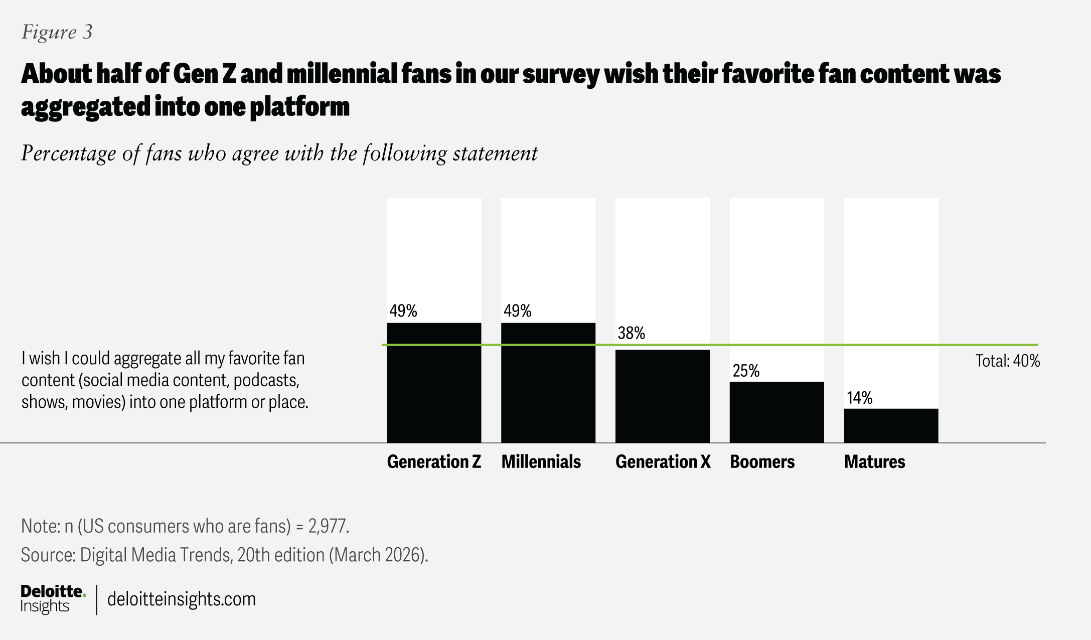 Some fans signal that this type of orchestration would be welcome: Forty percent of fans (49% of Gen Z and millennial fans) wish they could aggregate all the content related to their favorite IP into one place (figure 3).