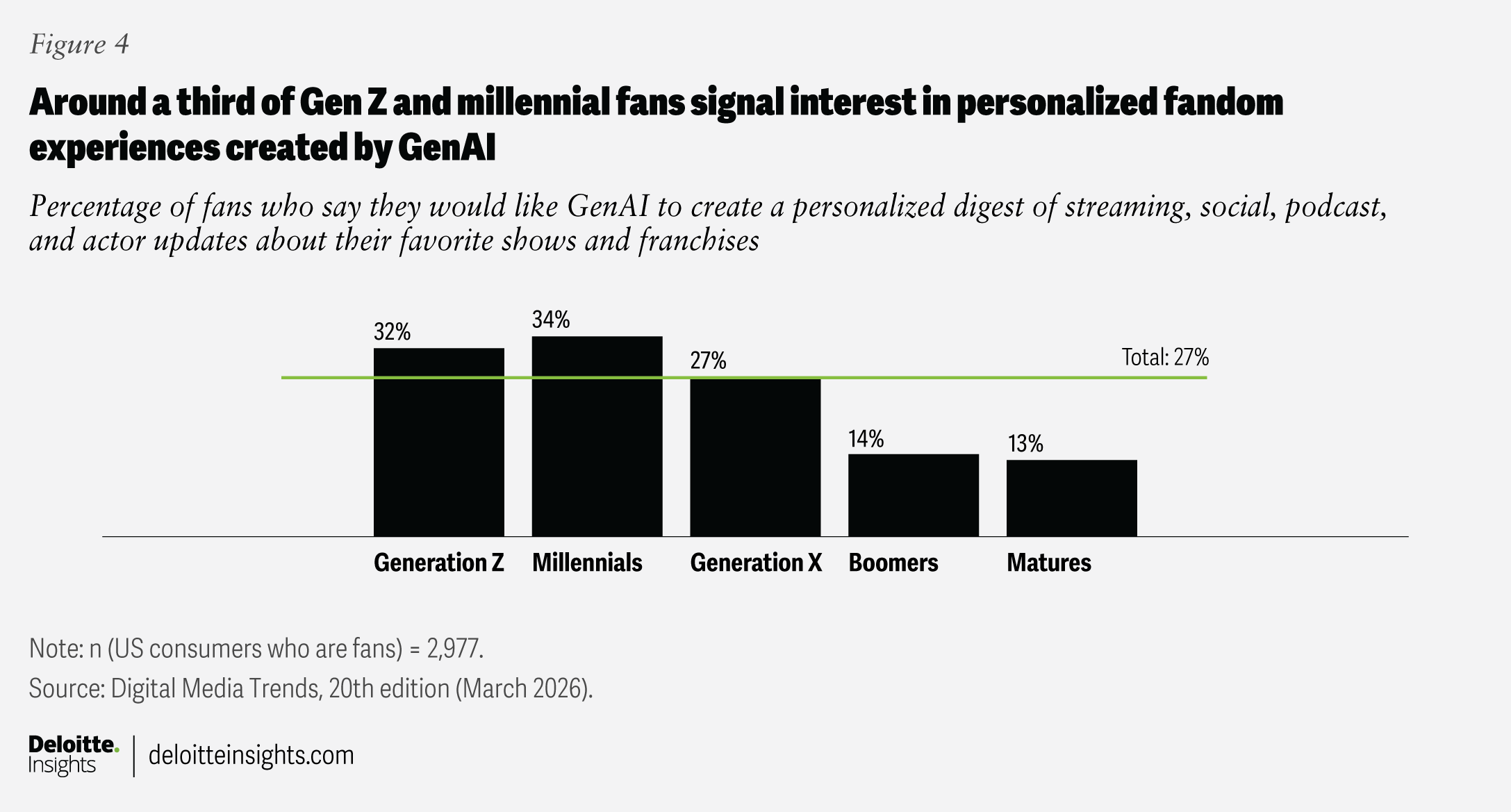 A more orchestrated and robust approach to fan data could improve ad-targeting efforts and enable higher cost per milles (CPMs) as well.21 In our Digital Media Trends, Fall 2025 survey, for example, almost 50% of fans said ads would be more effective if they were personalized to their fandoms. It could also lower advertisers’ development and production costs. Some fans are open to AI-generated advertisements, with around a third saying they “don’t care” if ads are made by gen AI.