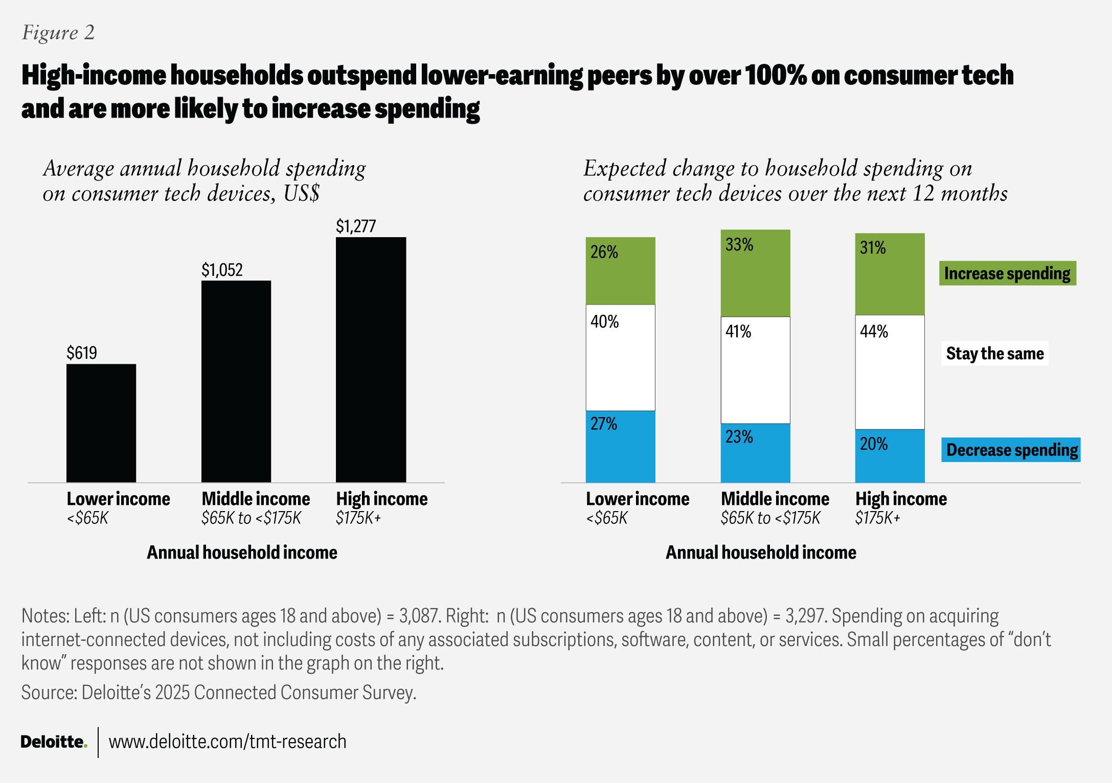 Consumer demand for technology remains resilient, though at very different levels depending on income. Deloitte’s 2025 Connected Consumer Survey reported that US households spent an average of $896 on consumer tech devices over the past year, up 17% from 2024.43 Looking ahead, 29% of consumers planned to increase device spending—triple the share in 2023—while 24% expected to cut back. Income-level analysis supports the K-shaped pattern: High-income44 households account for significantly greater tech spending already and show a stronger appetite for future purchases, positioning them to drive much of consumer tech’s near-term growth (figure 2).
