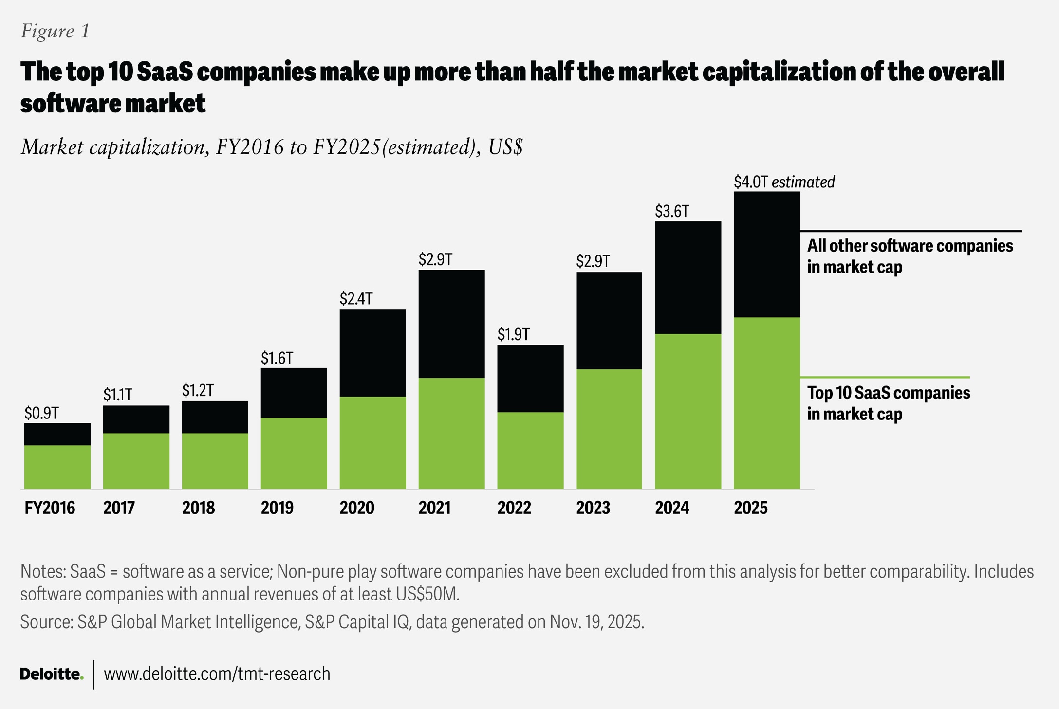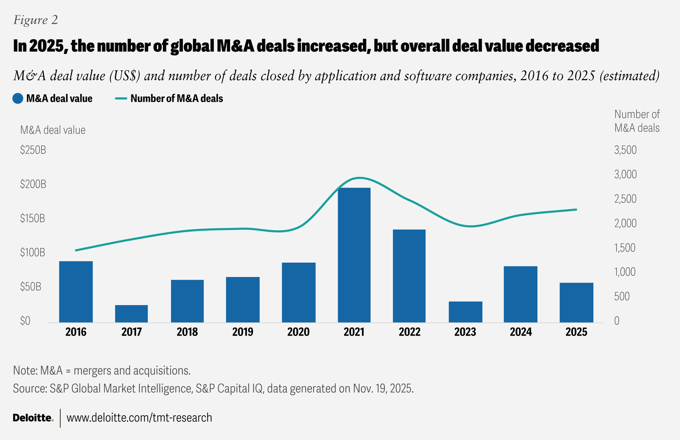 In 2026, established software players are expected to focus on becoming full-stack, end-to-end agentic platforms—helping to build, run, orchestrate and govern agents across functions in their bid to strengthen customer confidence and boost revenue. Some are heavily investing in cloud, infrastructure, and data platforms, signaling this strategic pivot.10 Established players are accelerating mergers and acquisitions to add AI-powered capabilities.11 In 2025, US software companies spent more on acquiring AI companies compared with the previous three years combined12 (figure 2).