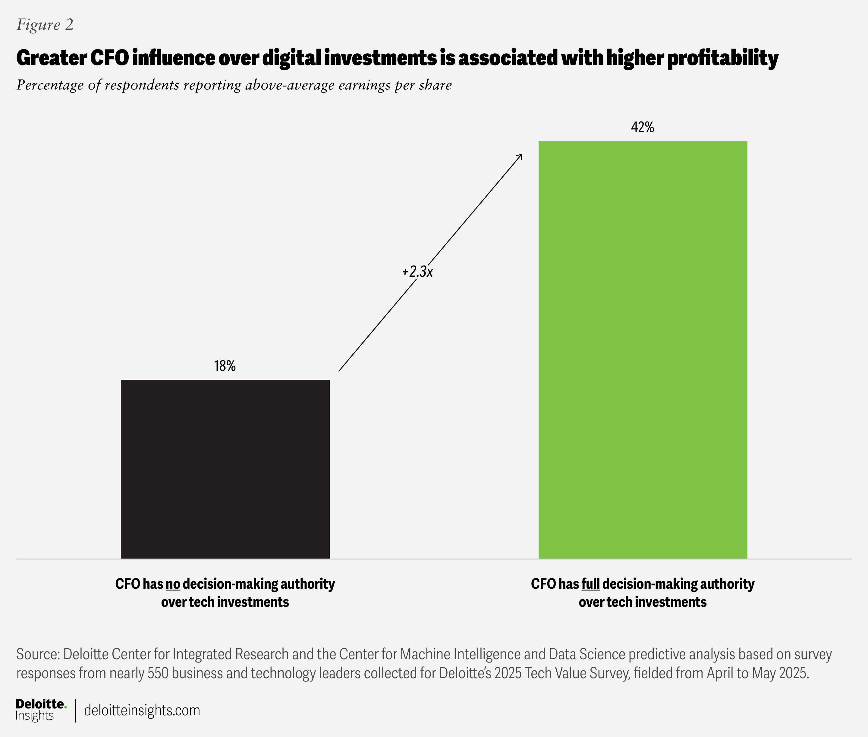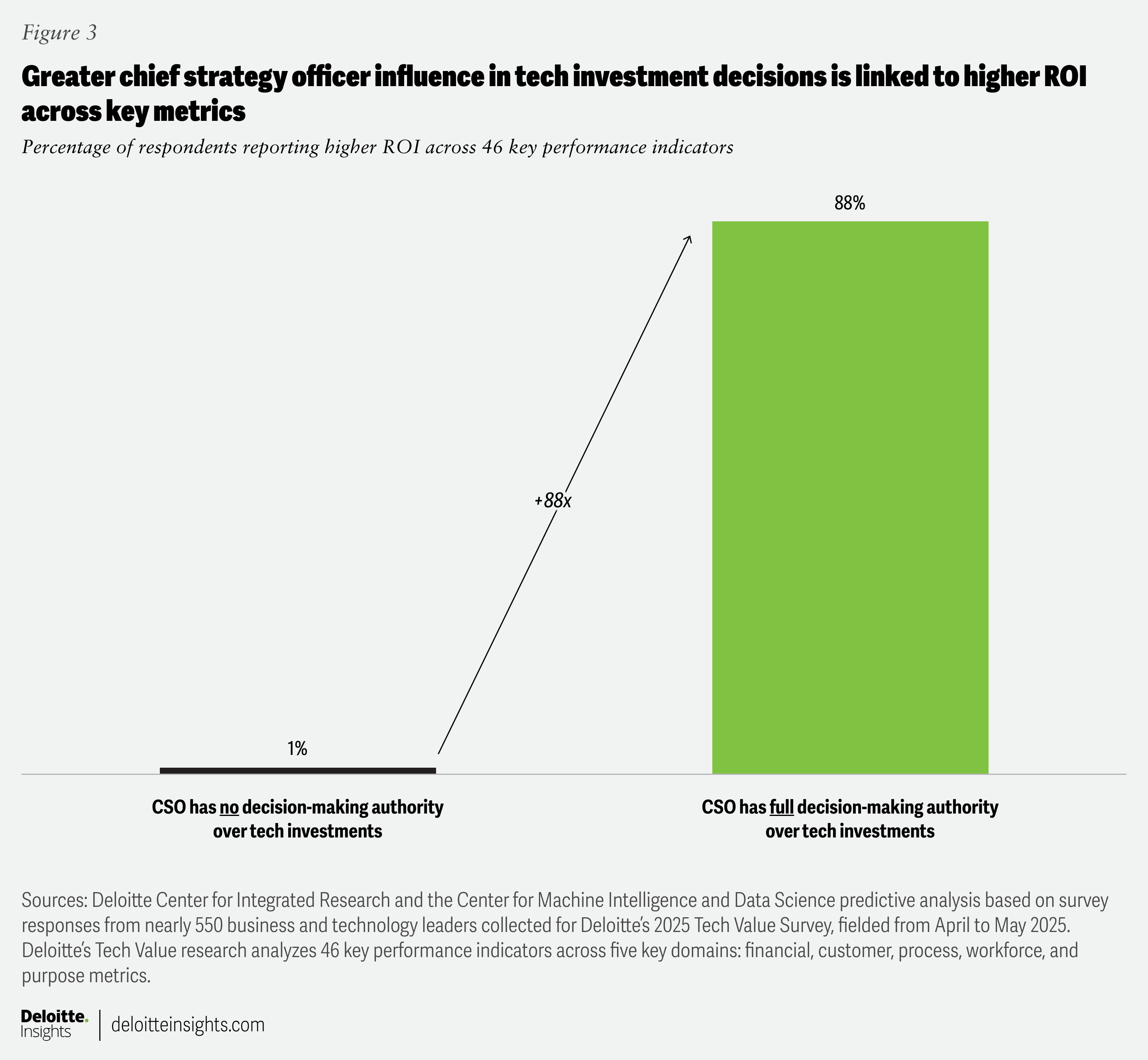 To explore this question, Deloitte ran a predictive analysis using our proprietary Tech Value data. In a survey of 550 business and technology leaders conducted in April and May 2025, we sought to understand how the degree to which a given C-suite leader owns IT decision-making corresponds with positive AI outcomes. Rather than take a surface-level view, we traced exactly which C-suite roles hold sway over AI investment decisions—zooming in on the degree of participation from chief technology officers, chief financial officers, chief strategy officers, and others. Then, we measured results using a robust set of indicators: perceived improvements in return on investment from technology, movement across 46 operational and financial key performance indicators, and reported earnings before interest, taxes, depreciation, and amortization (EBITDA) gains over the past year.