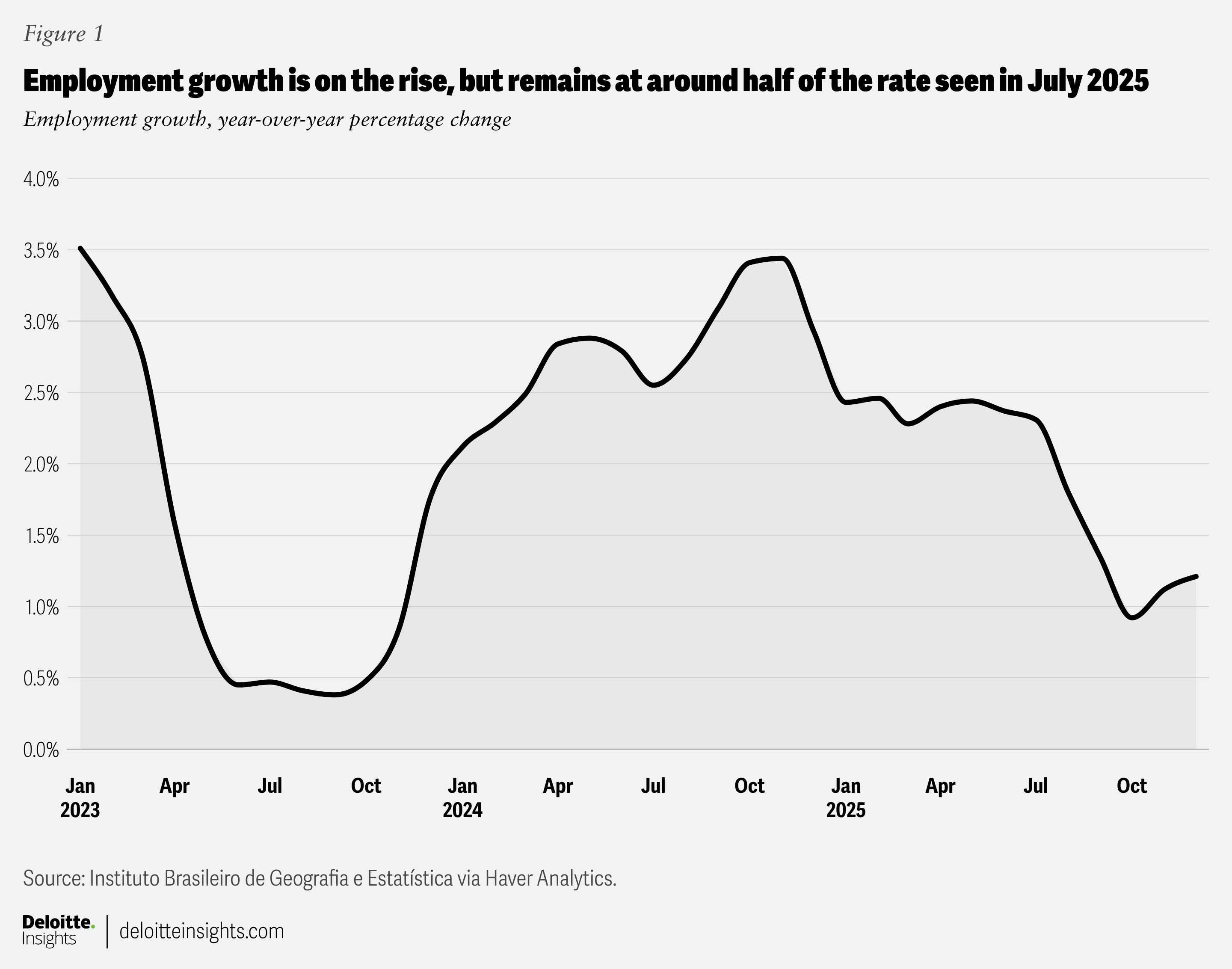 But despite this good news around employment growth, cracks are beginning to emerge: For one, the pace of year-ago job growth in December was half of the July numbers (figure 1). On a month-to-month basis, employment fell for three consecutive months before rising again in November and December. Although private sector employment continues to grow at a relatively healthy pace, public sector employment is growing faster—rising 3.9% from a year earlier in December. However, public sector support for the labor market is unlikely to be sustained if the government is to stabilize its debt.