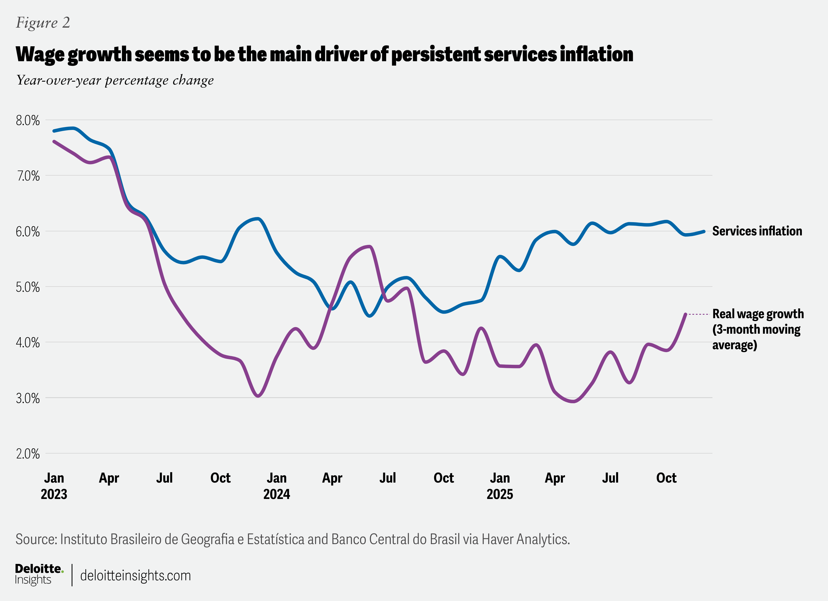 Overall, the Banco Central do Brasil is expected to begin cutting interest rates soon. With the policy rate standing at 15% since June 202523 and headline inflation moving lower, the real interest rate is very high and climbing. This alone should allow for rate cuts, as doing so would merely preserve the real rate that prevailed last year. However, cuts are likely to be slow. Wage growth remains strong, and fiscal policy is still loose—both of which risk pushing inflation back above the central bank’s target range.