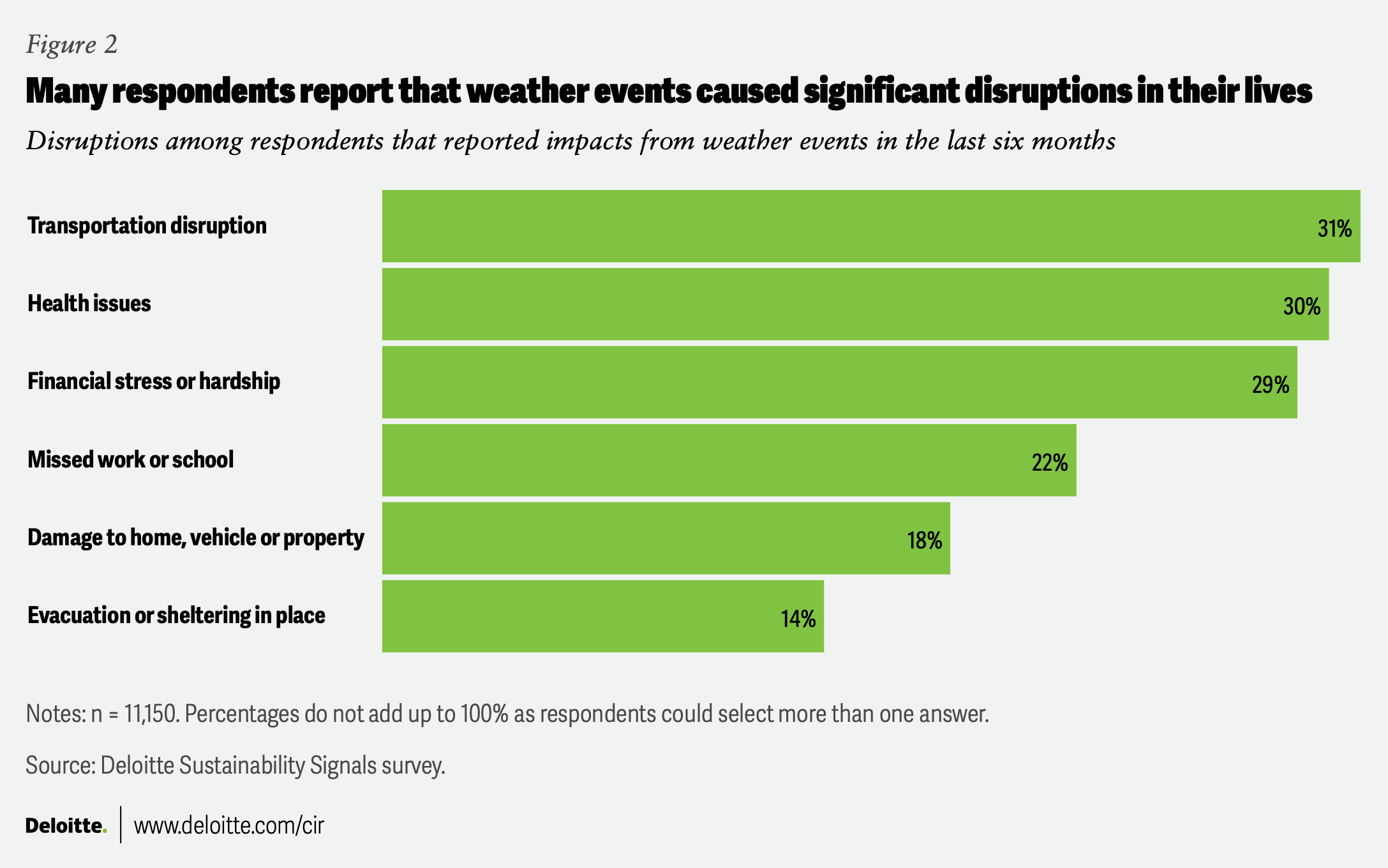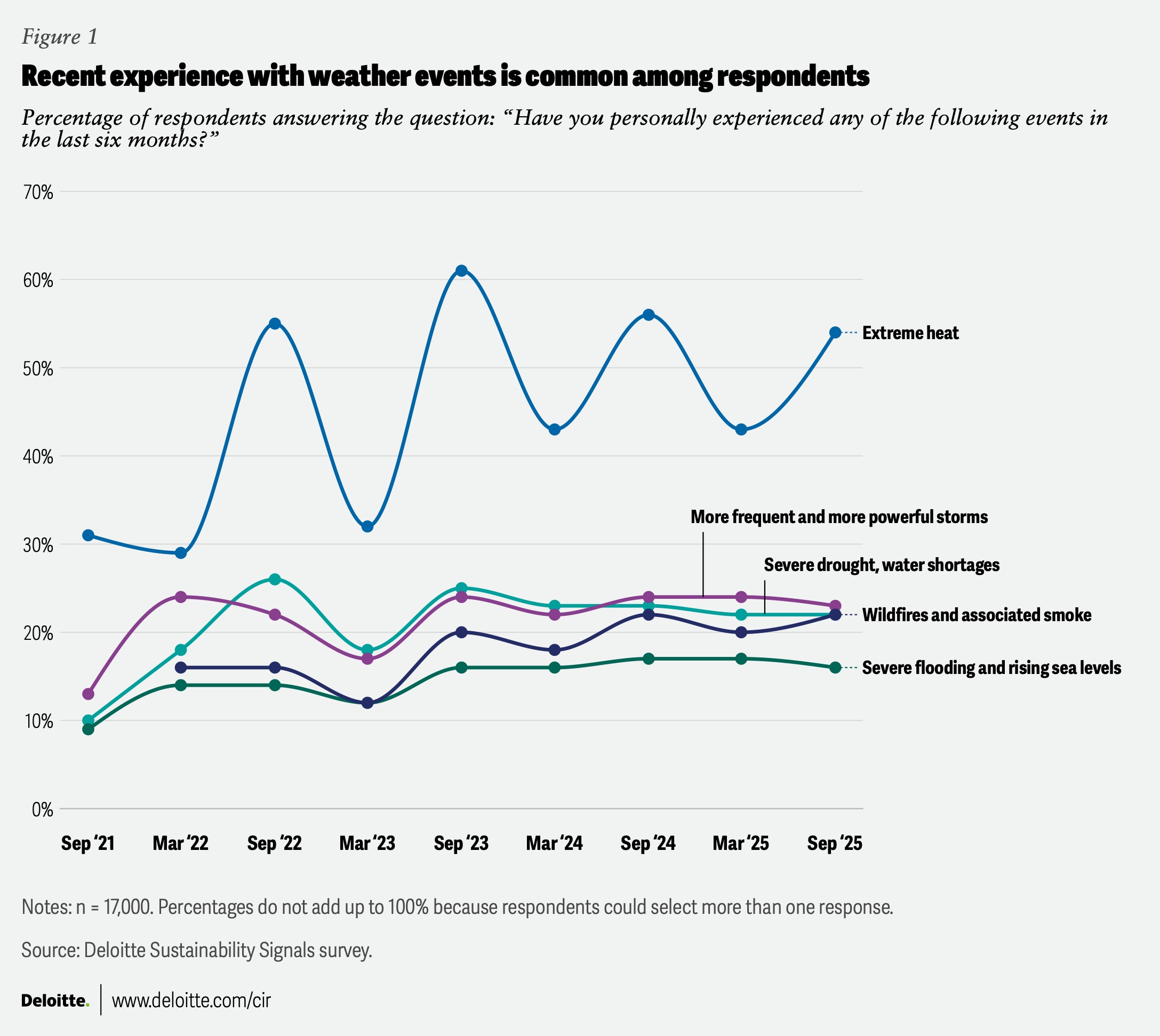 Deloitte’s survey of individuals’ sustainability-related experiences across nearly 20 countries indicates that direct experience with a variety of weather events is pervasive and, in some regions and among some cohorts, becoming increasingly common.3 Globally, 66% of respondents said they had experienced one or more extreme weather events in the last six months. More than half of the respondents reported living through extreme heat. Weather-related disruption is often a frequent condition shaping day-to-day workforce and household dynamics.