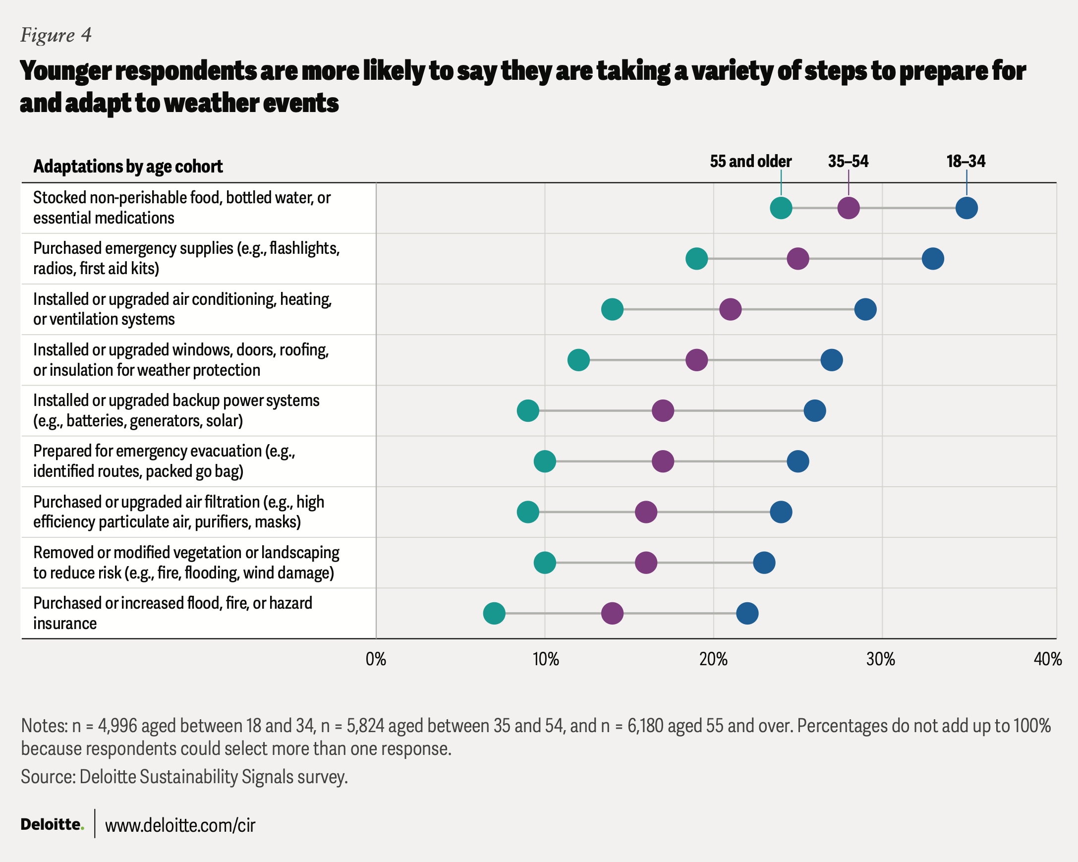 Fifty-four percent of people across 17 countries now report taking steps to increase their personal and household resilience in the face of weather and challenging environmental conditions. Lower-cost steps to increase general preparedness were the most common: Twenty-nine percent of respondents globally said they’d stocked non-perishable food and other supplies in the past six months, and 25% reported purchasing other emergency supplies like flashlights or first aid kits. In the wake of the third-hottest summer on record in the Northern Hemisphere,6 more than 1 in 5 respondents said they’d recently invested in heating, ventilation, and air conditioning upgrades. Working-age respondents (those over the age of 18) were significantly more likely to say they had taken steps to bolster their personal resilience compared to participants from other age groups (figure 4).