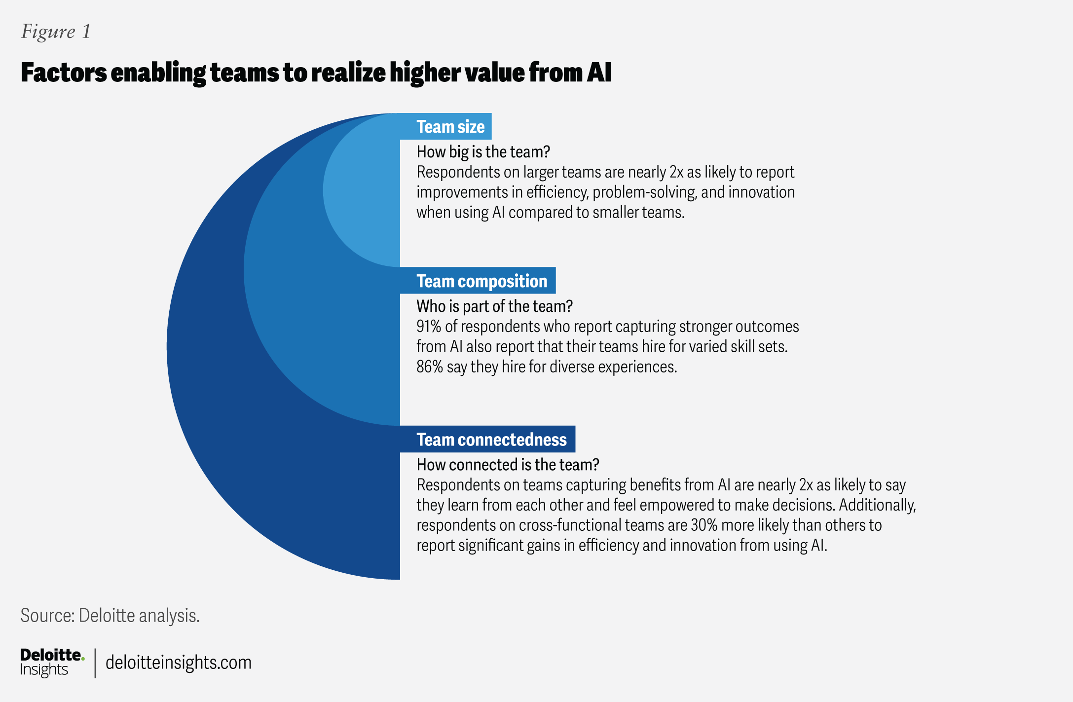 That gap matters because while AI decisions are often made at the enterprise level, success is often driven by what happens closer to the ground—within teams. Examining how teams are structured and how they work together can reveal why AI outcomes align with expectations, or not. In July 2025, Deloitte’s Center for Integrated Research surveyed 1,400 US professionals across various industries and found stark differences between teams that reported capturing higher value from AI versus those that didn’t. Our research uncovered three key themes related to team size, composition, and connectedness (figure 1).