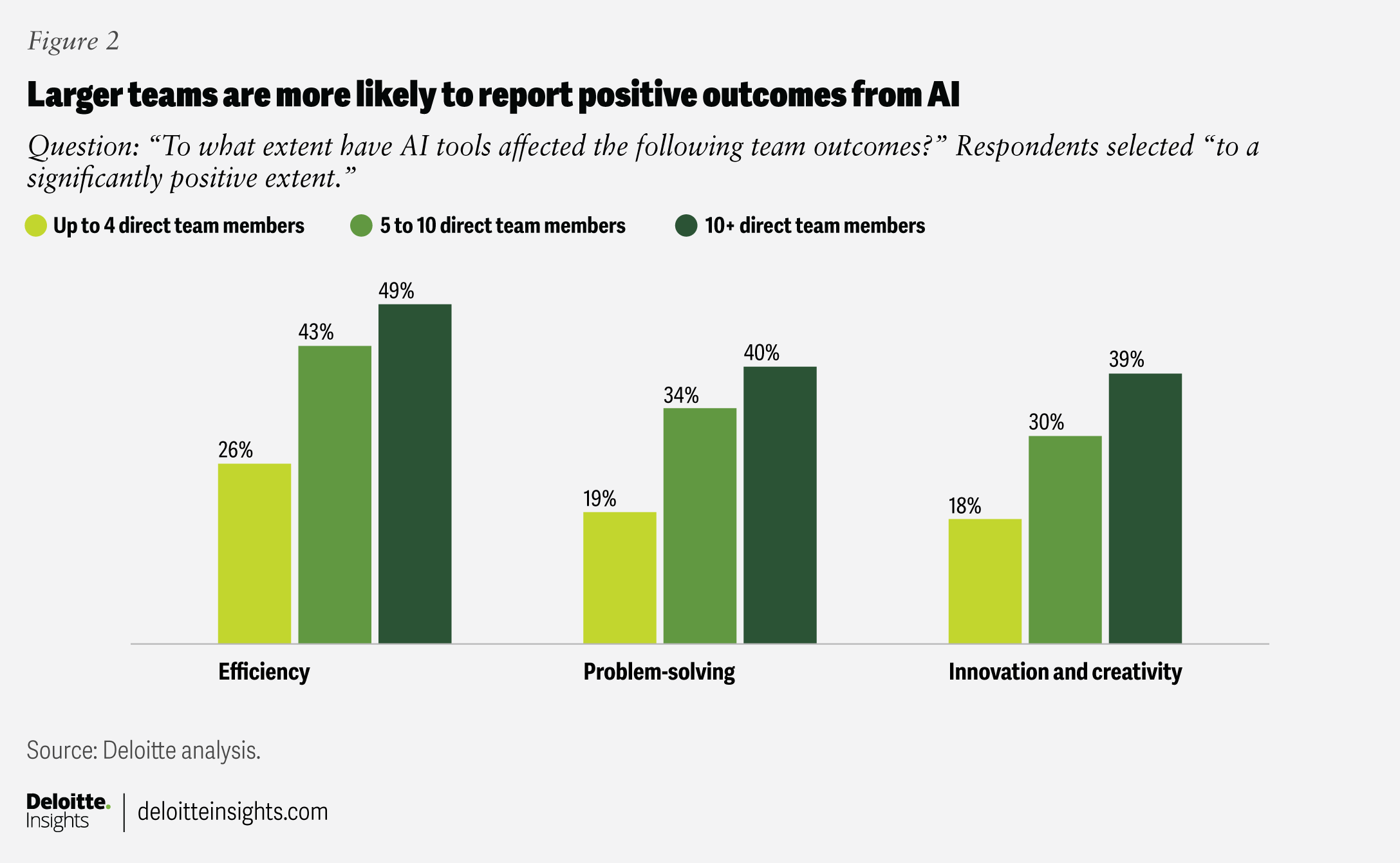For our analysis, we categorized teams into three sizes (up to four team members, five to 10 members, and more than 10 members) and found that AI usage by teams, as well as the effectiveness of AI at achieving work outcomes, increased proportionately with team size.